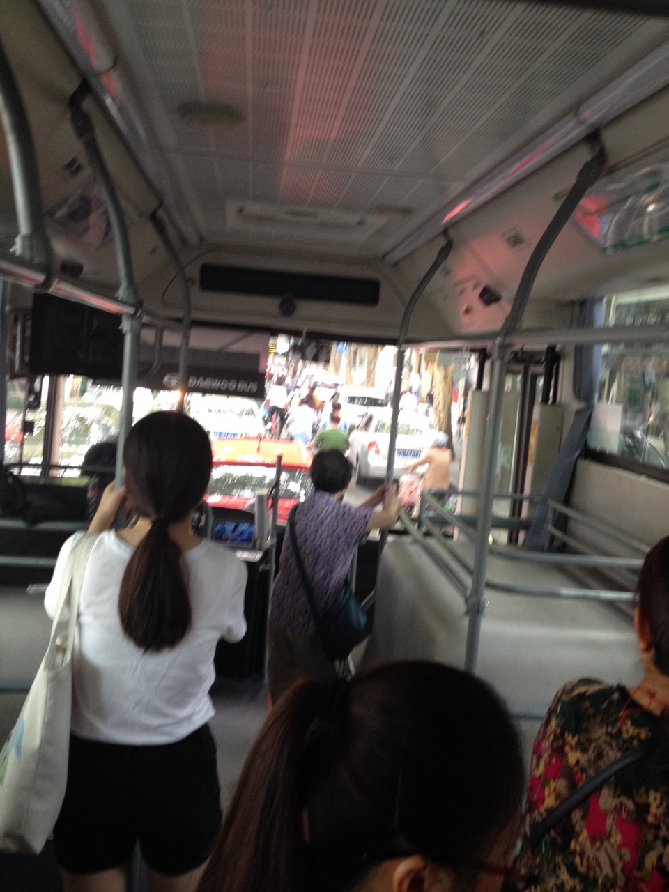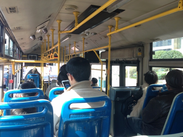 バスの2階の最前列に座る人が多いが、上海は高層ビルが多いので、後ろの方の席に座った方が視界が開けてて見やすいと思った。