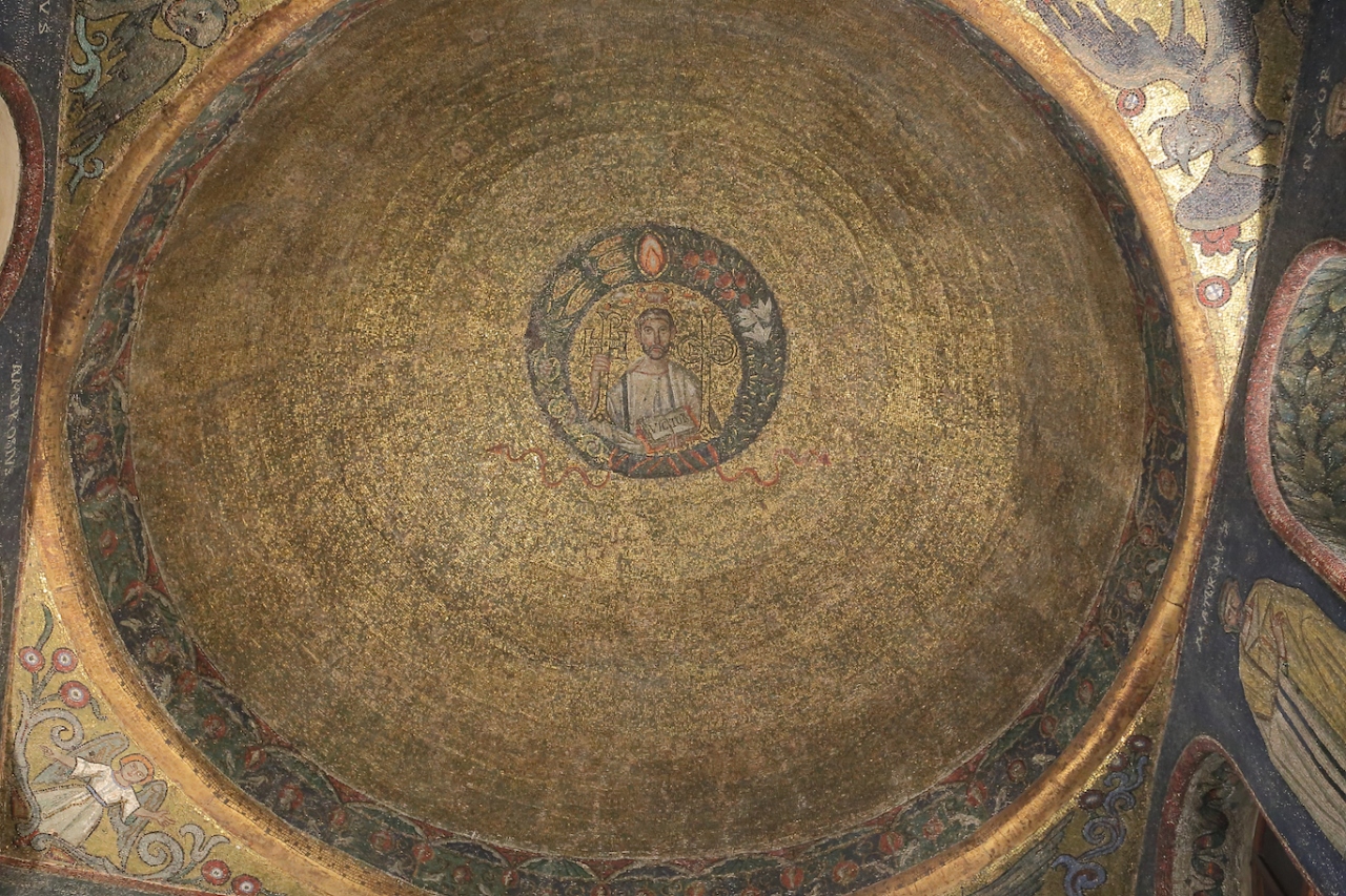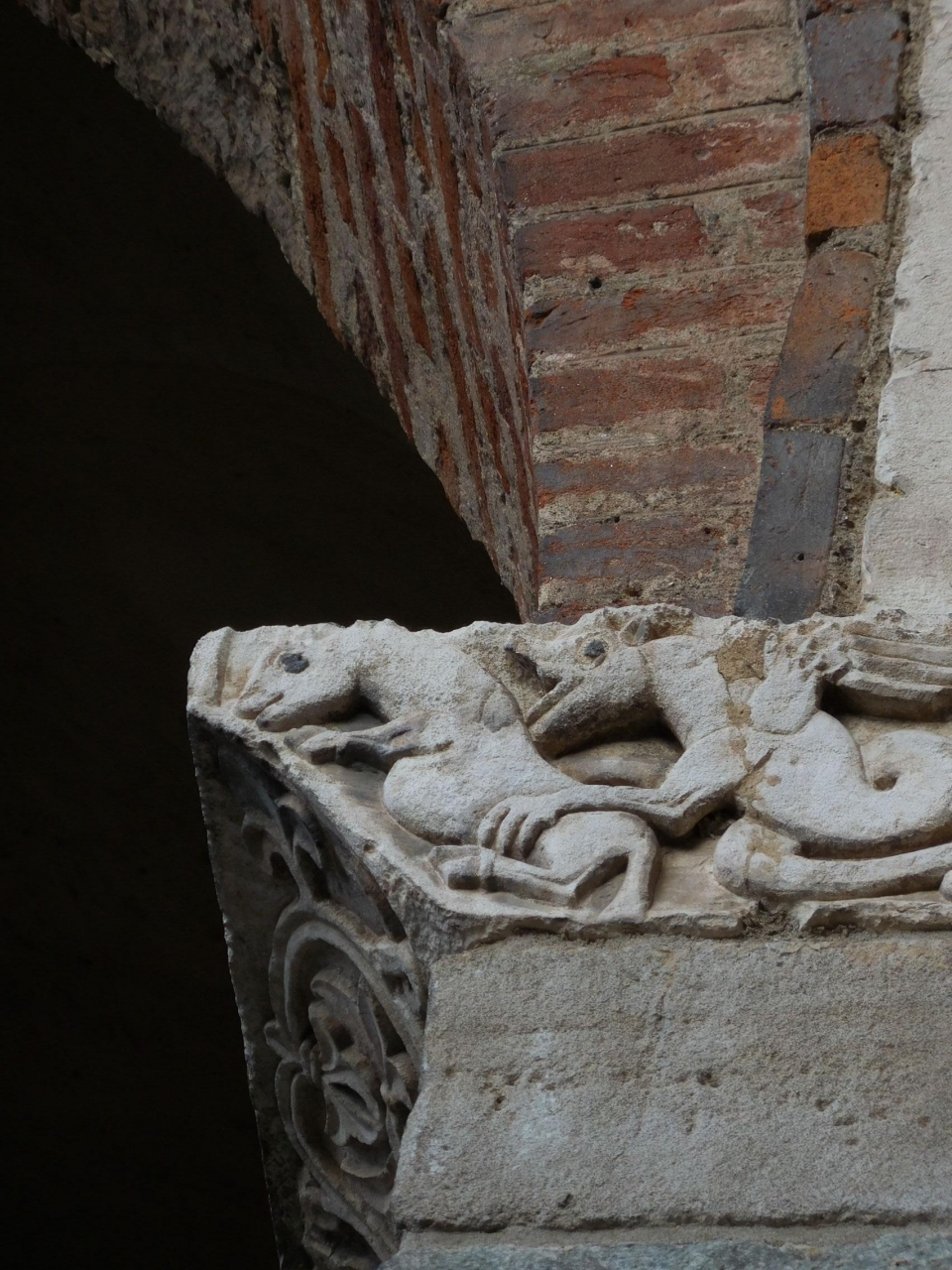 古いロマネスク様式の教会で、ファサードの前に回廊が配置されています。この回廊に古いモザイクや彫刻で聖人とか怪物が書かれていて、中々興味深いです。古い教会らしく内部はシンプルで、華美な装飾は一切ありません。礼拝堂はイタリアらしく絵画で飾り立てられていますが、身廊の部分は質素な感じです。祭壇もモザイク画で飾られていて、古い教会なんだな、というのを実感できます。また有料ですが、サン・ヴィットーレ・イン・チェル・ドーロ礼拝堂は一面モザイクで飾られており、こちらはより一層歴史を感じさせます。