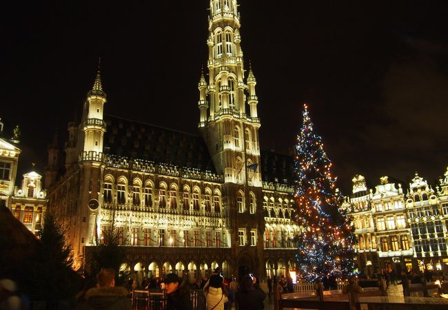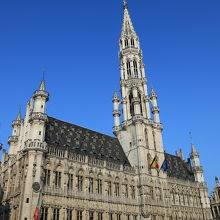石畳で覆われた広場「グランプラス」で最も目を惹くのは(どの建物も目を惹きつける美しさを誇っていますが)、15世紀の初めにゴ... 続きを読むシック・フランボワイヤン様式で建てられた市庁舎。当初はライオンの階段と左翼しかなかったのですが、1445年に少し短めの右翼が、1455年に高さ約100メートルもある中央の塔が増築され現在の姿となりました。外壁はたくさんの彫像と繊細な装飾彫刻で覆われており美しいばかりの眺め。