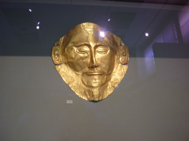エーゲ海文明のうち、同じ青銅器文明の他の二つ(クレタとトロイア)と異なり、ミケーネ文明は、エーゲ海から大陸に進出し、先住民を攻略しつつ、小国分立していったといわれ、城壁も他と異なって堅固なものとなり、独特の円形墳墓を残しています。写真はその中から出土した黄金のマスク。