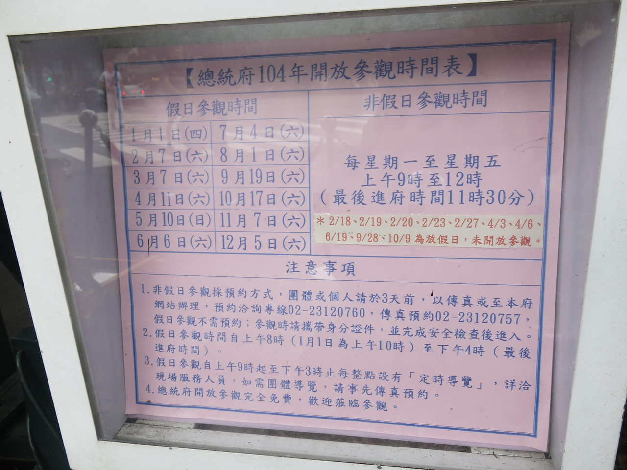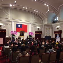 かれこれ20年前に台北で釜の飯を食べていた方々との懐古的旅行で総統府を訪れました。ラッキーなことに月に一度の一般公開日に当... 続きを読むたり、台北賓館と併せて参観致しました。外観は昔も見たことがありましたが、まさか内部まで参観できるとは時代が変わったものです(当時は建物に近づくと衛兵が威嚇してくると脅されてましたが)。入口付近でパスポートとバッグの中身チェックを受けましたが、ビデオカメラは持ち込み不可でロッカーまで先導され預けさせられました(英語が上手い若者でとても丁寧な対応でした)が、写真撮影だけならOKです。ここは日本統治時代の樺山総督、乃木総督、明石総督といった歴代の総督の執務場所でしたが戦後の今も総統府として大事に使用されています。台北の歴史的建造物の多くは1900年代初旬に建てられたものですが、この時代に日本国内以上のコストと熱意をかけて街づくりがなされたことが明らかであり、こうした遺産が日本以上に残っているという意味について考えさせられました。普段はテレビのニュースでしか見ることのできない国内外の賓客との会談部屋や、中庭も見れました。また総統府の歴史を説明する展示物会場も充実していたのには驚きました。それらをじっくり観ると二時間はかかります。雨模様の天気のせいでしょうか、あまり参観者は多くなかったですが、日によっては行列ができて入場制限もかかるそうです。興味おありの方は是非ホームページで一般公開日をチェックして訪問されることをお勧めします(英語訳はありますが和訳は無い模様です)。