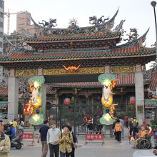 とにかく人が多く、張りぼてが飾ってあったり、門の上には電光掲示板があり賑わっていて派手な印象です。