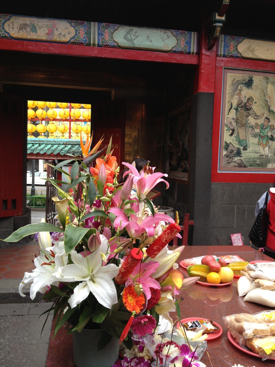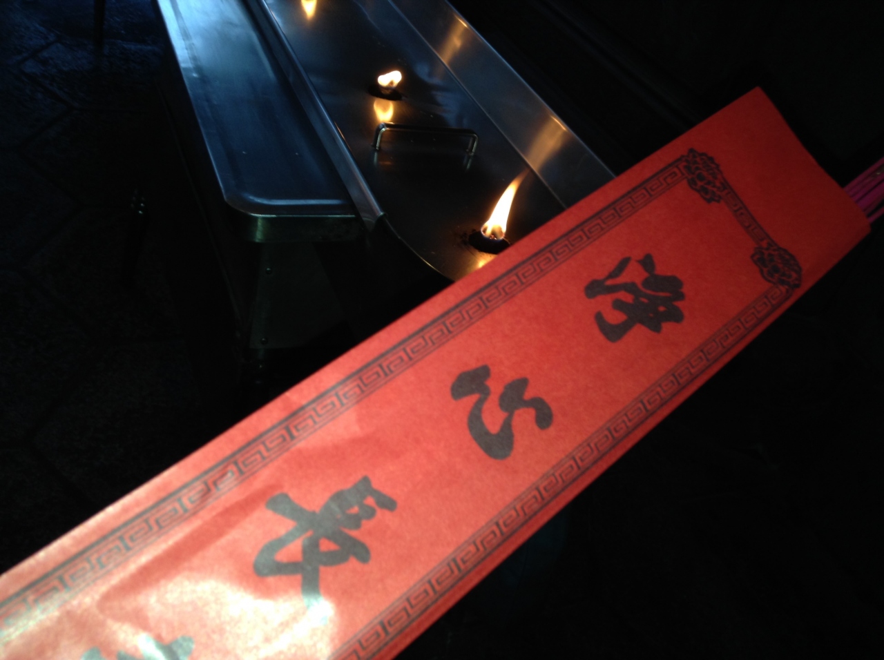 入り口で線香を頂き、作法に則ってお参り。縁結びの神様、月下老人のお堂の前には「赤い糸」があるそうで、こちらでおみくじを引くと頂けるそうです。