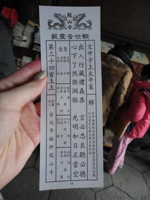 ここで体験したほうが良いのは、台湾式のおみくじです。おみくじを選ぶのに、木でできた勾玉みたいなものを投げて判断する感じで、面白かったです。おみくじも漢字なので、内容がおおよそわかってよかったです。ぜひ試してください。