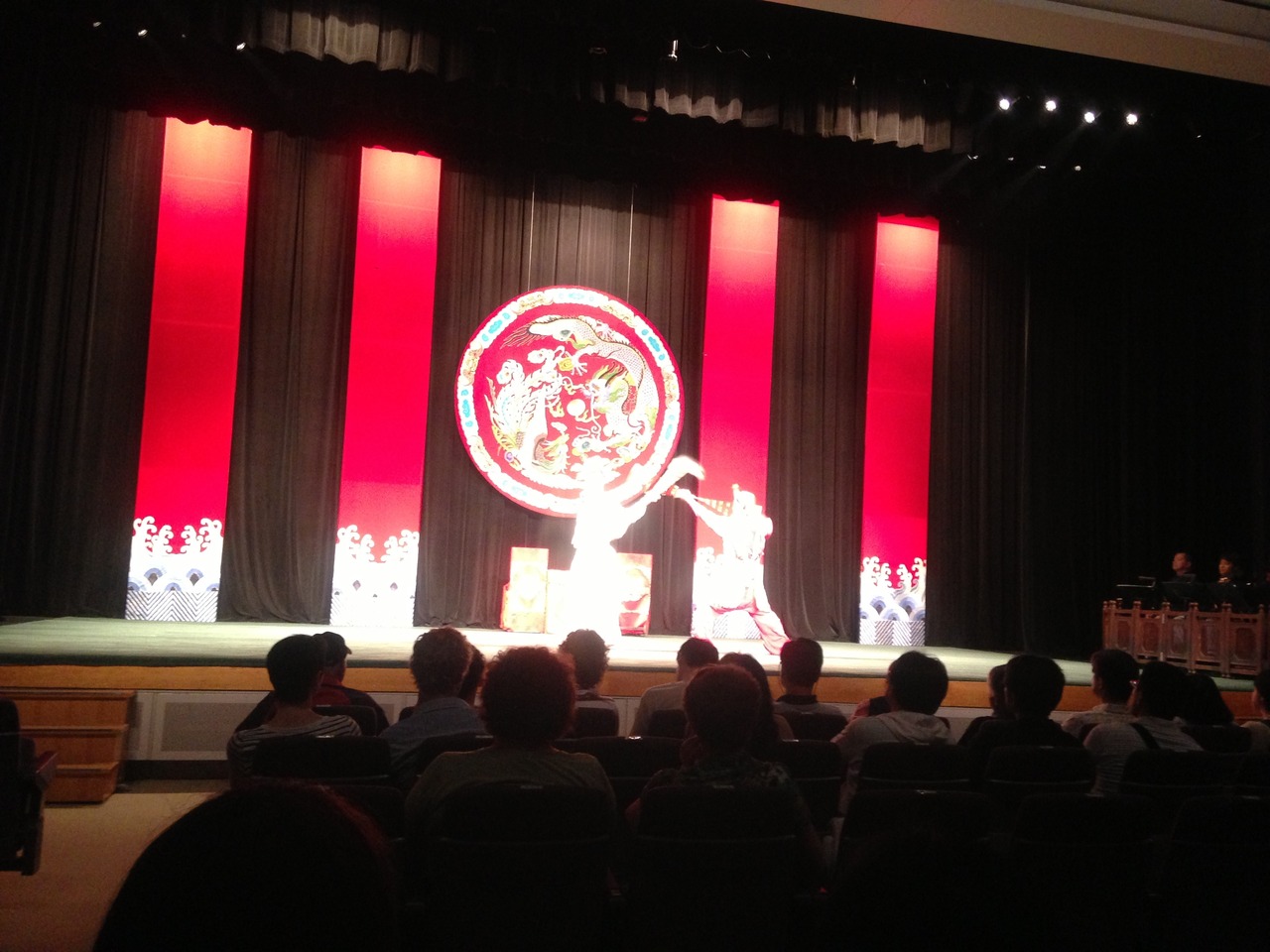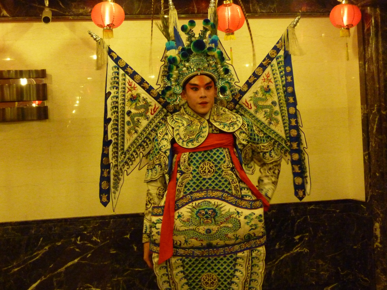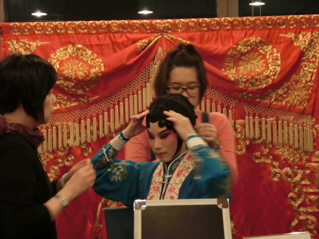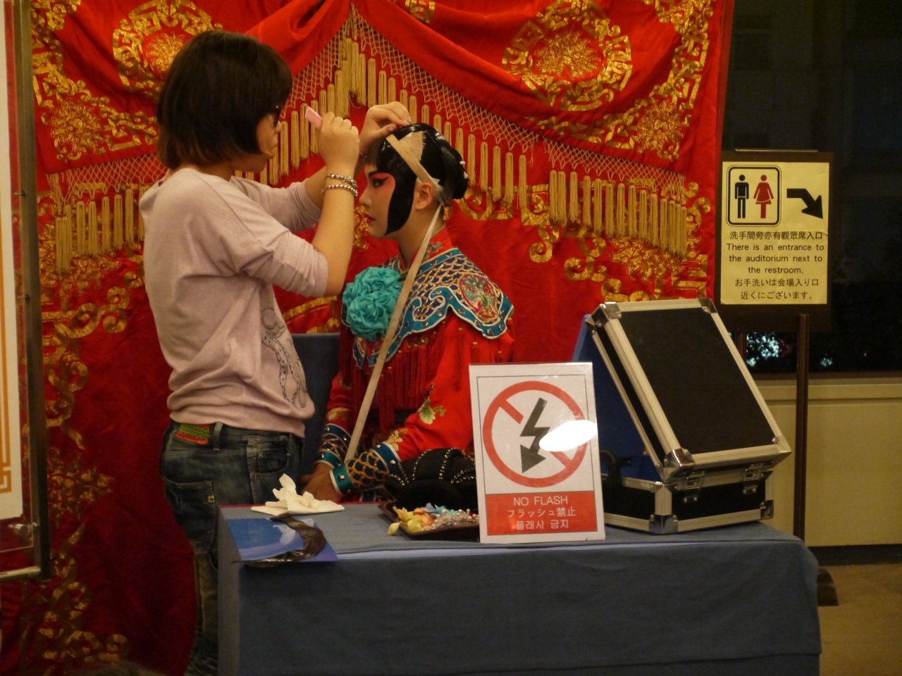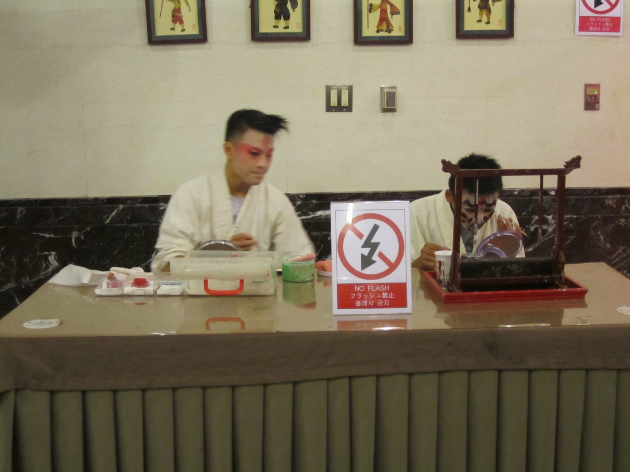 劇場は3階にあるのですが、劇場が開く前、一階で伝統的な人形劇の人形を見せてくれたり、舞台が始まる前、3階ロビーでは演者さんが実際に京劇のメイクをしていたり、伝統的な楽器の演奏を聞かせてくれます。また、幕間には数人の京劇の衣装をまとった演者さんが順番に生歌を聞かせてくれ、舞台のほかにも見所がたくさん。お客さんを楽しませる工夫が随所にされていると感じました。