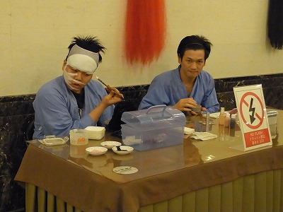劇場へは3階までエレベーターで移動。エレベーターに乗り込む時に半券をもぎってもらうが、もぎる間エレベーターあきっぱなし、エレベーターが一杯になったら閉めるという妙なシステムだった。3階について席だけとりあえず確保しホワイエに戻ったら演者がメイクするところ。開演までの30分程、全く飽きる事なく、飽きさせない工夫があるのはとても良いと感じた。
