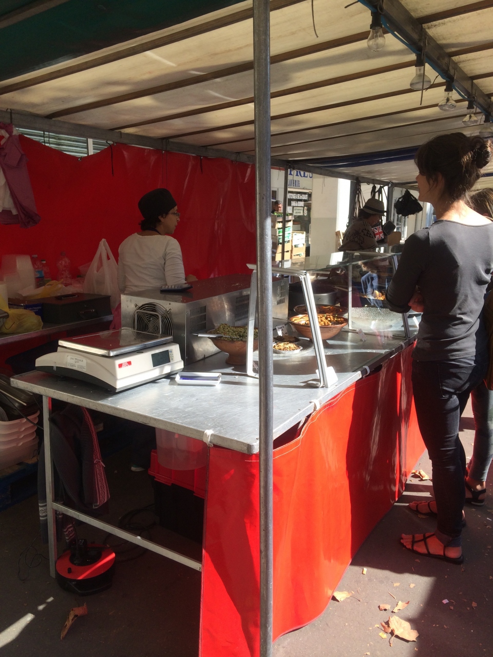 私が行ったときは食品を販売している店は無く、奥の方に車で移動販売している軽食がある程度でした。地下鉄駅の傍のトルコ料理(ケバブ)のお店が安くて美味しかったです。