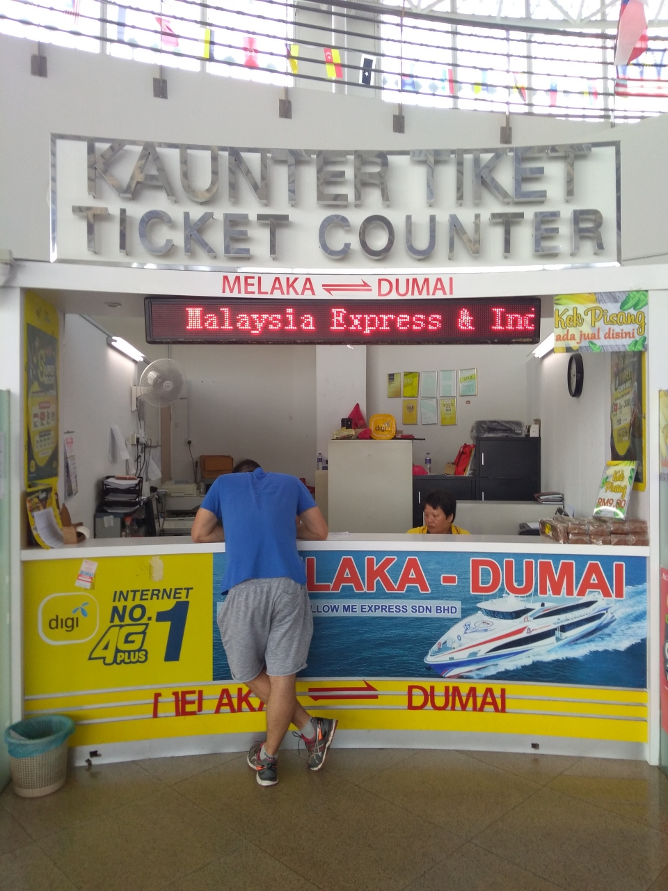 マラッカからインドネシア、スマトラ島のドゥマイへ渡るボートが1日1便出ています。場所はマラッカ川の河口付近にあるICQCフ... 続きを読むェリーターミナル。出発時間は毎日午前10時。ボートに乗る前に出国手続きが必要なので午前9時までにチェックインしなければなりません。料金は110RM+Tax25RMで合計135RM。往復で買うとTax込みで195RMになります。所要2.5hですがマレーシアとは時差があるのでご注意を (ドゥマイの方が1h遅い)。ドゥマイ港からインドネシアに入国する場合はビザが必要です。港でアライバルビザが取れます。チケットカウンターの人には1ヶ月ビザが35ドルだと言われました。