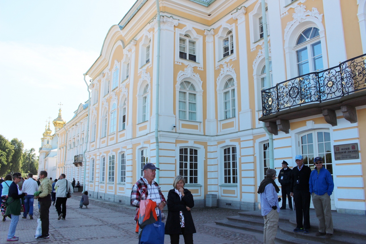 (2)エルミタージュ美術館の裏から朝10時発の高速船に乗り約30分でペテルゴーフに到着。宮殿前の大滝を横目に階段を上り、大宮殿の中に入れるかどうか分からなかったがとにかく建物入口に行く。ざーと5~60人が並んで待っていた。しばらくして誘導が始まった。皆どんどん建物の中に入って行く。私の番になると入口案内人から止められて切符は聞かれる。案内人の横に並んでいた人(多分ツアーガイドの人と思う)がこの人はツアー客ではないとロシア語で云ったようだ。私は「切符は無い、これから買う」と答える。ロシア語はしゃべれないので身振り手振りで。するとこの入口案内人いとも簡単に「建物の中を指差し、あそこで切符を購入しなさい。」と云う。切符売り場窓口には1人しか並んでいなかったので簡単に切符を入手出来た。並んでいた5~60人は皆ツアーの人達なのか良く分からないがいなかった。