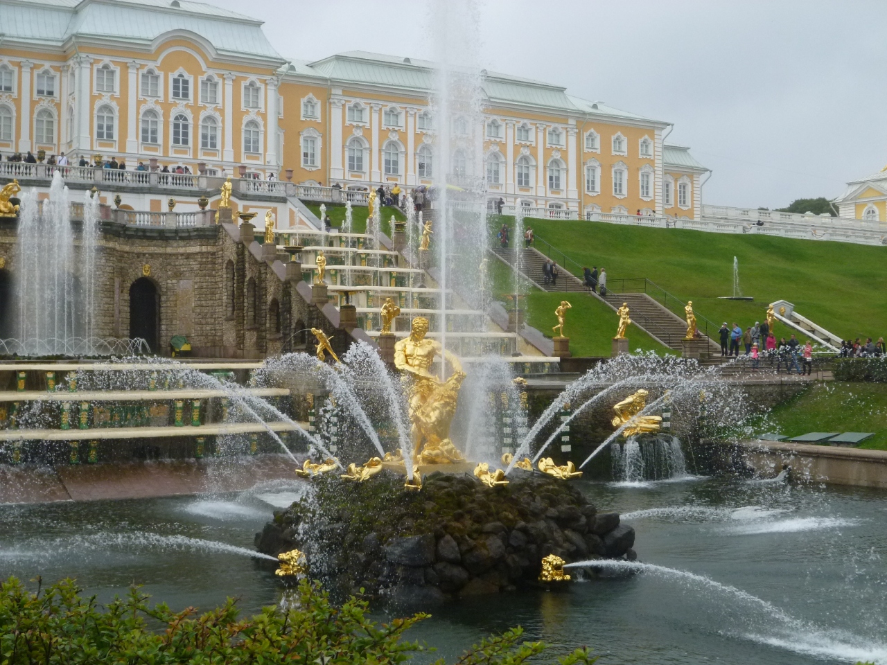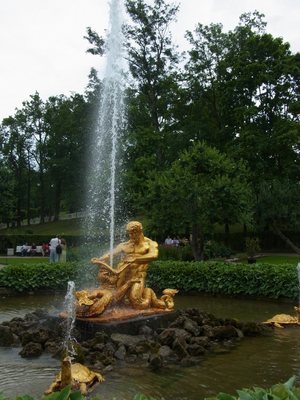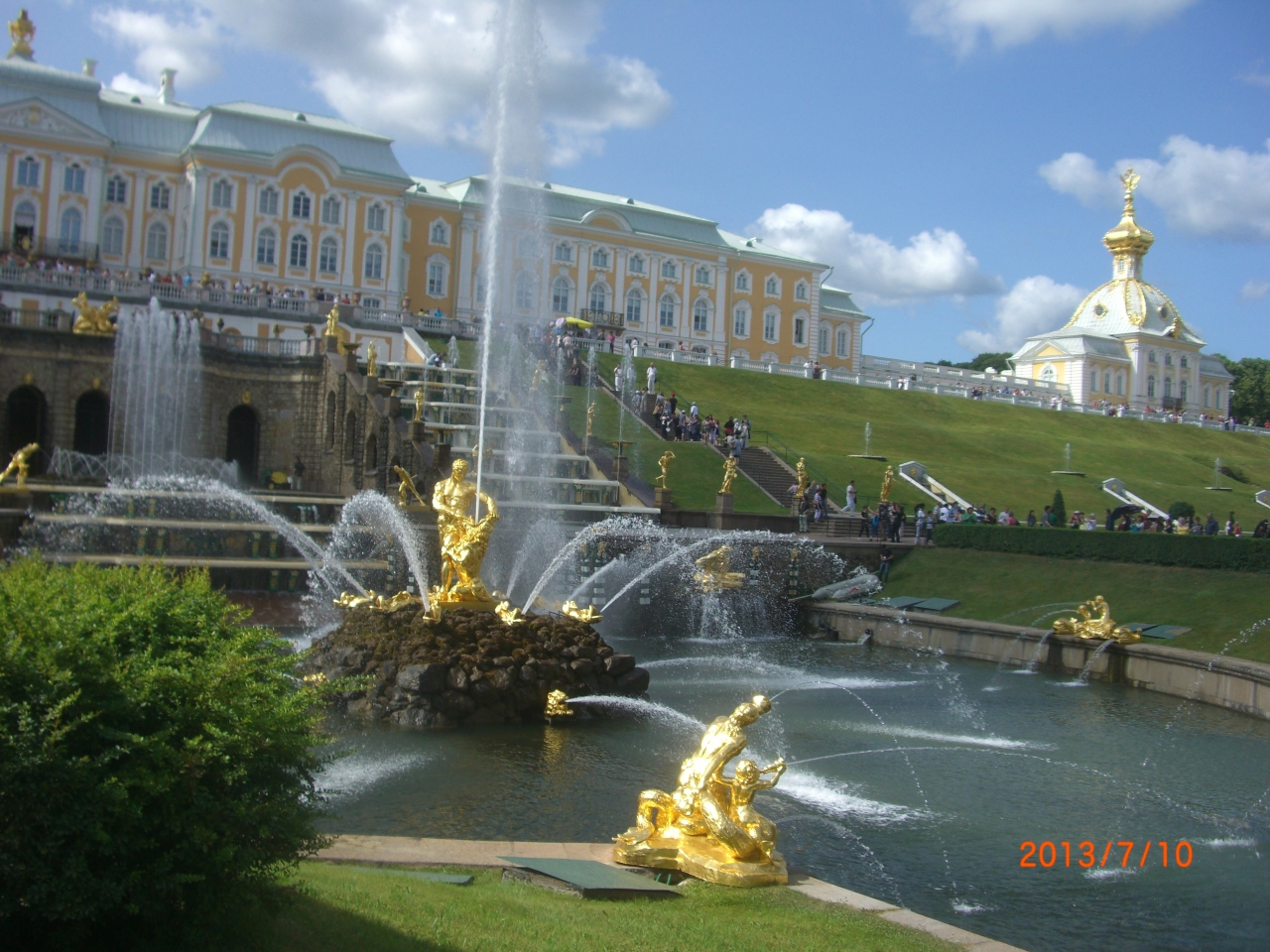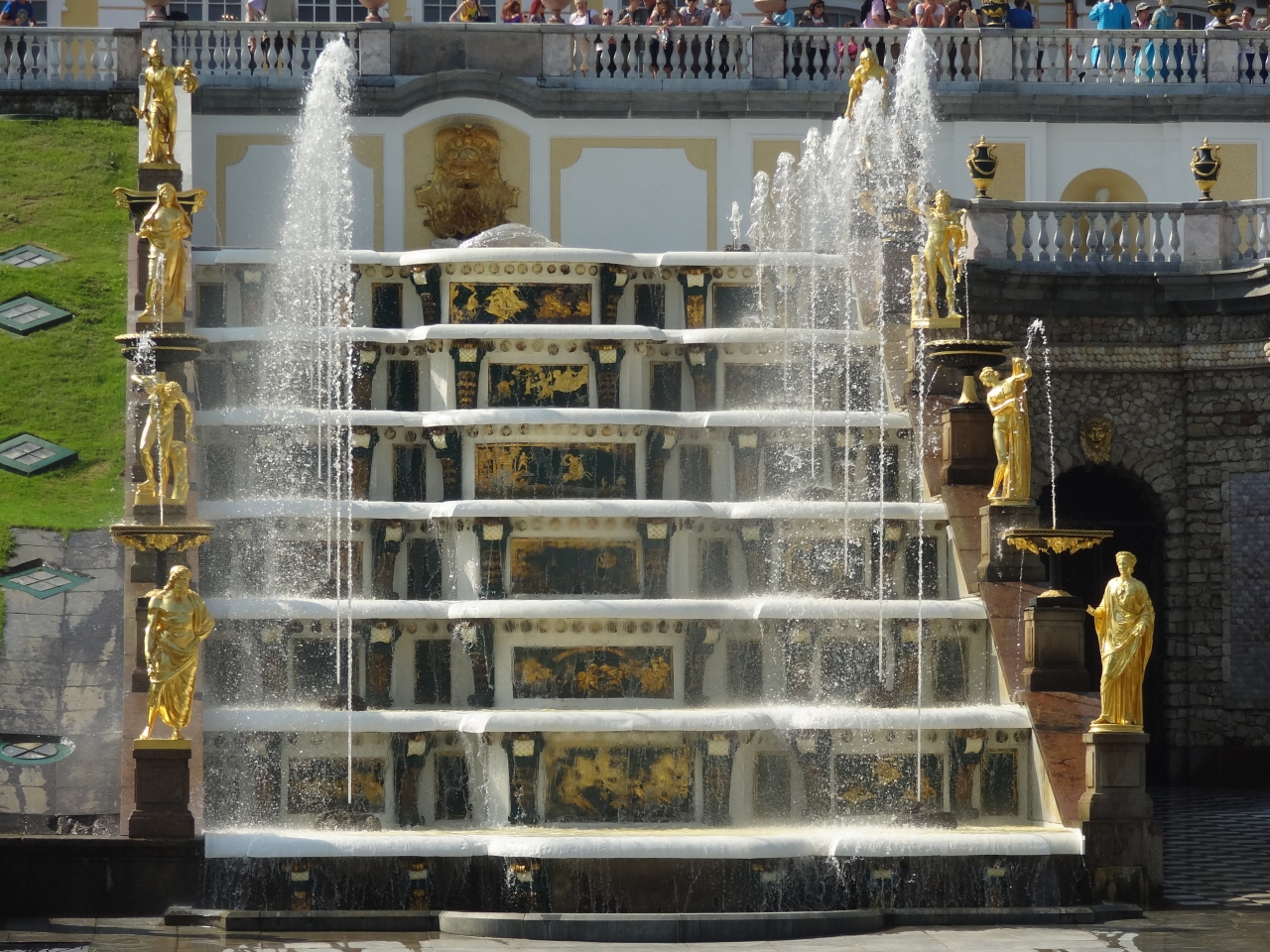 金色に輝く像から水が噴出するいちばん有名な噴水はじめ、上を通ると水がビヤッと出てきてびしょ濡れになっちゃう噴水やピラミッド噴水など多彩なのですが、バスツアーで行くと全然時間が足りませんでした。