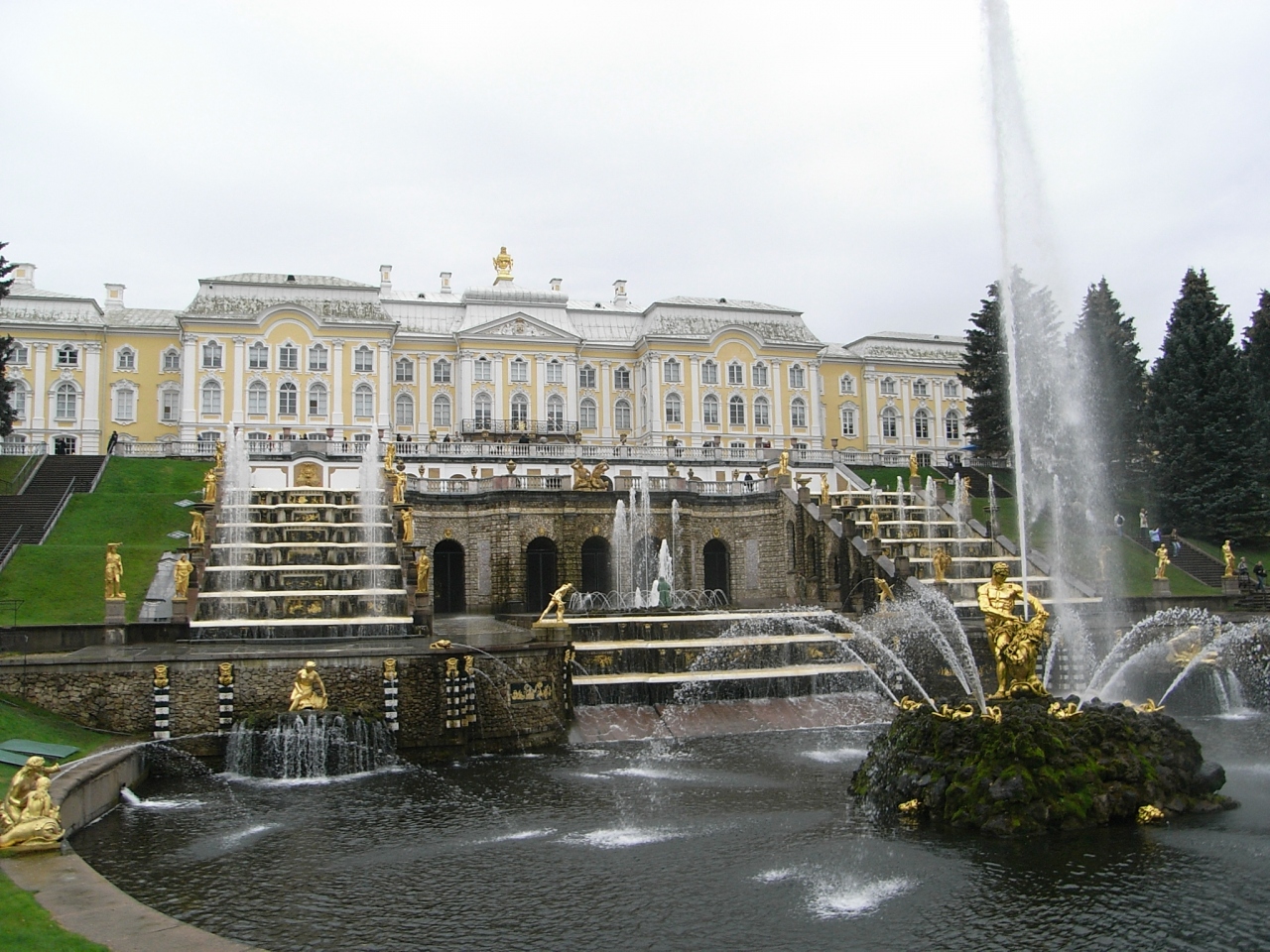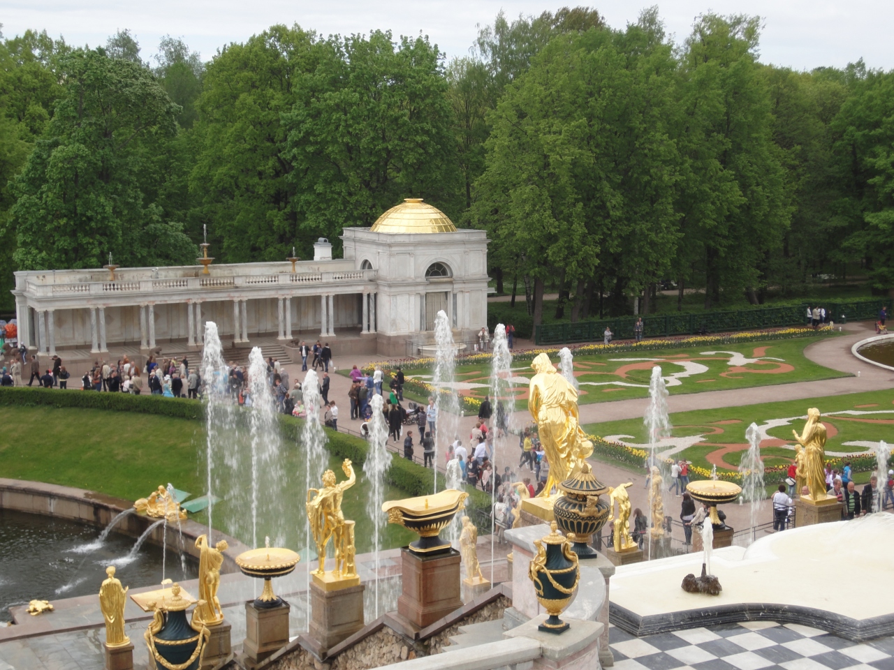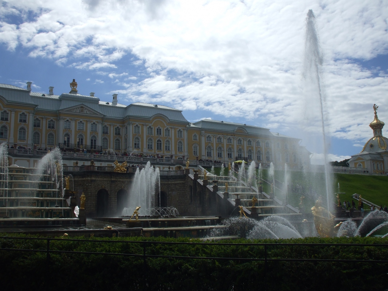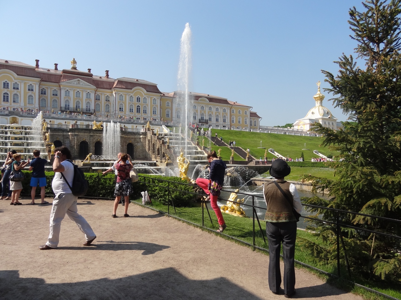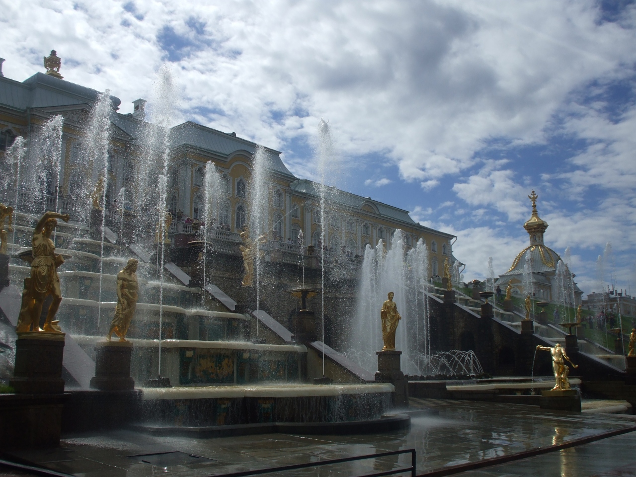 金色に輝く像から水が噴出するいちばん有名な噴水はじめ、上を通ると水がビヤッと出てきてびしょ濡れになっちゃう噴水やピラミッド噴水など多彩なのですが、バスツアーで行くと全然時間が足りませんでした。