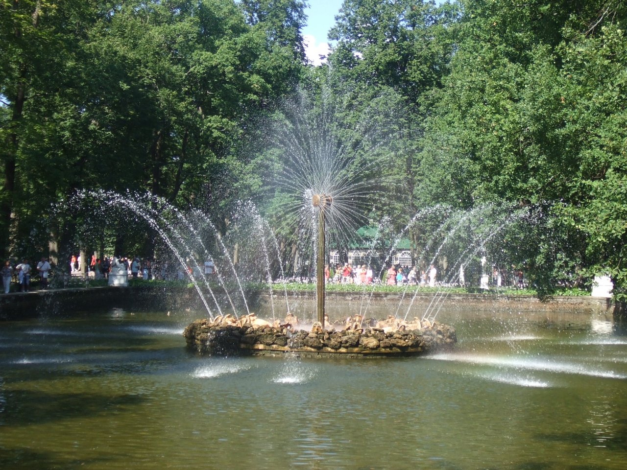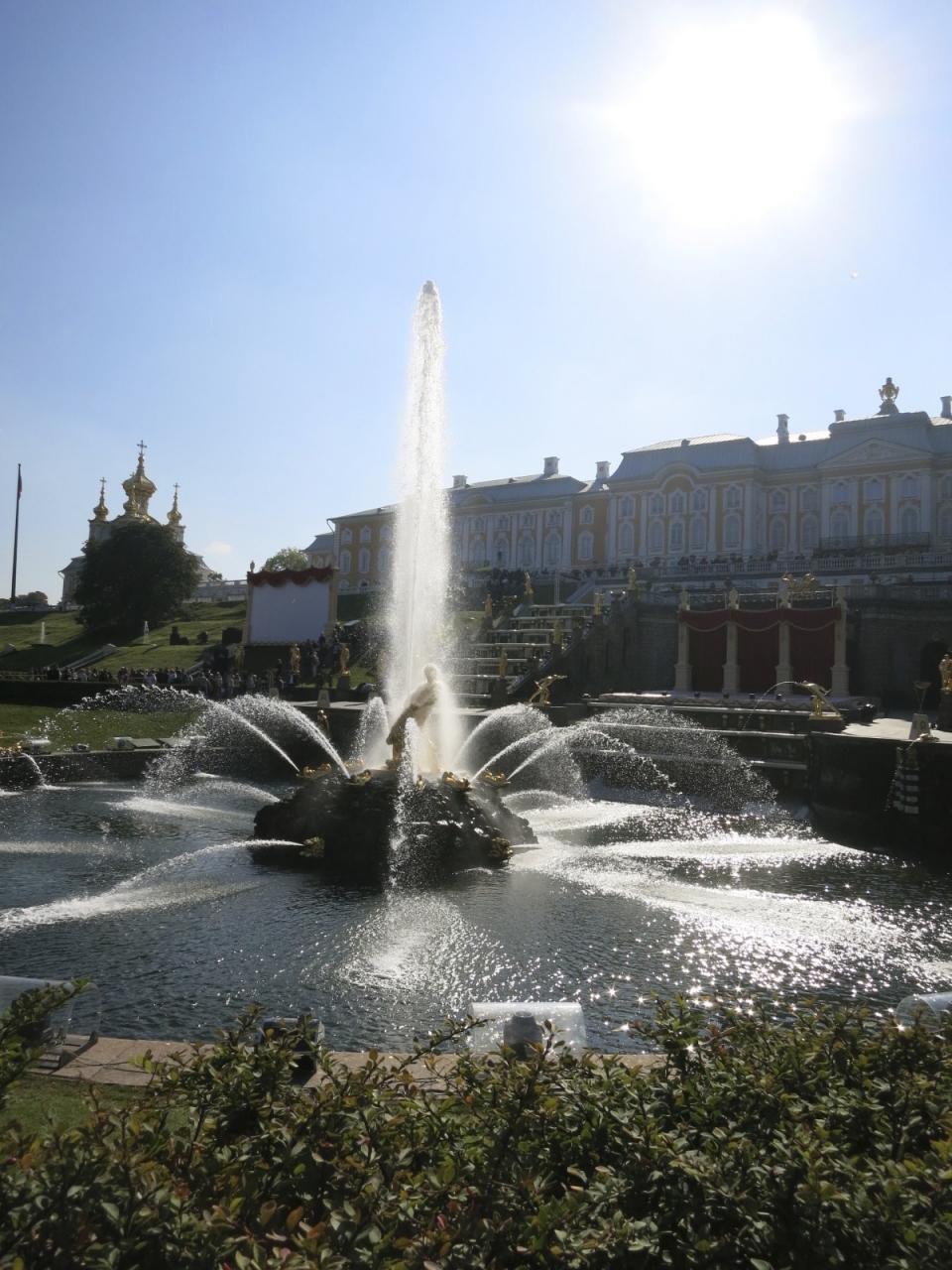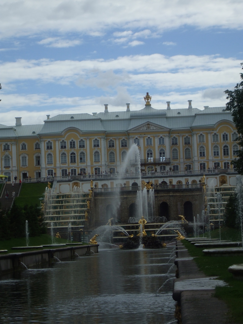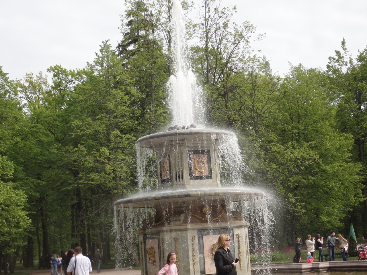金色に輝く像から水が噴出するいちばん有名な噴水はじめ、上を通ると水がビヤッと出てきてびしょ濡れになっちゃう噴水やピラミッド噴水など多彩なのですが、バスツアーで行くと全然時間が足りませんでした。