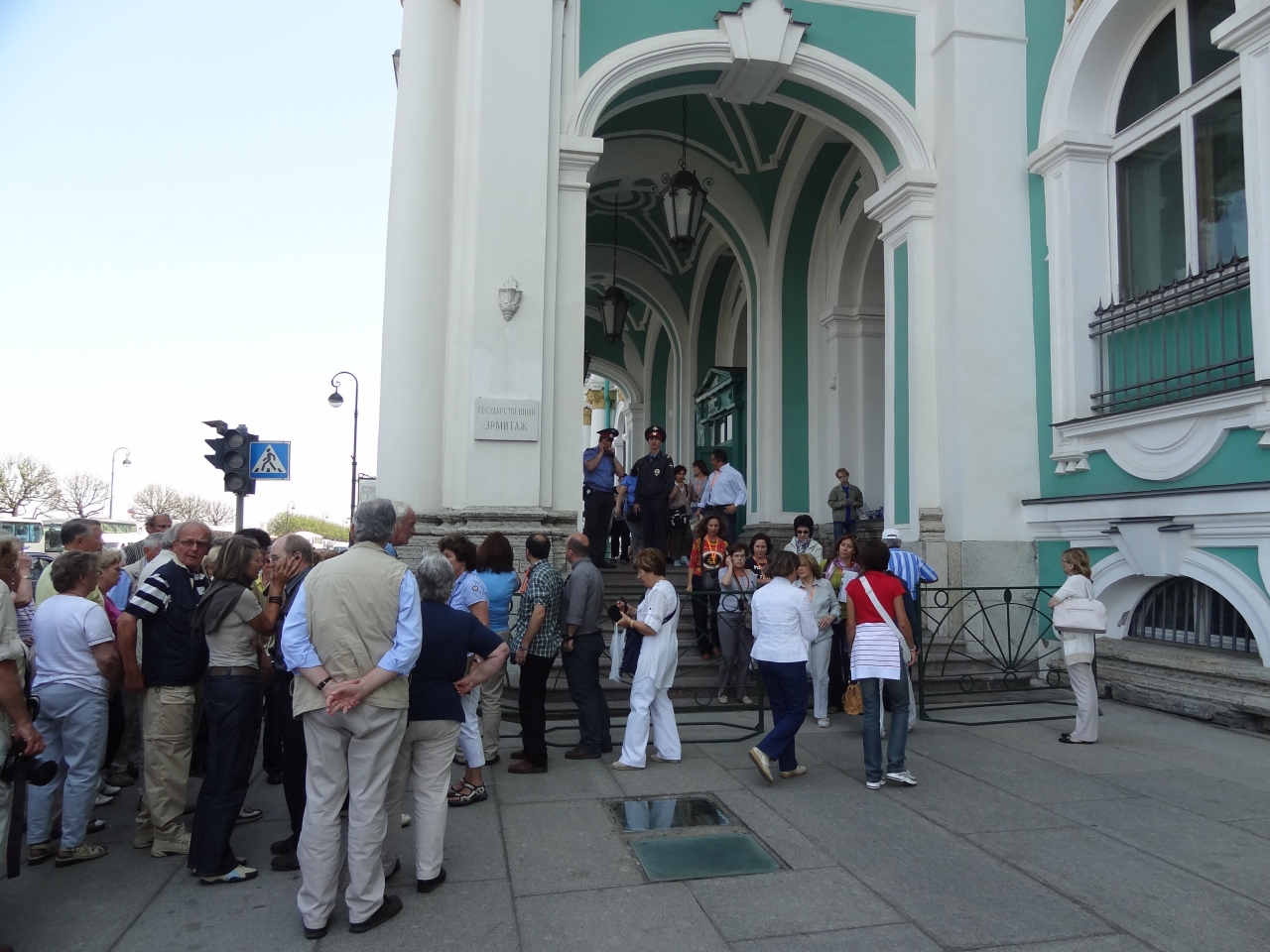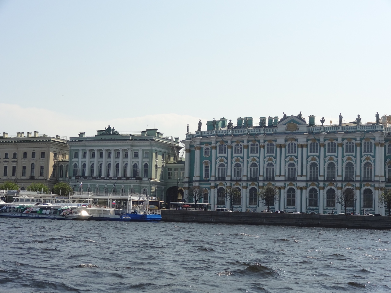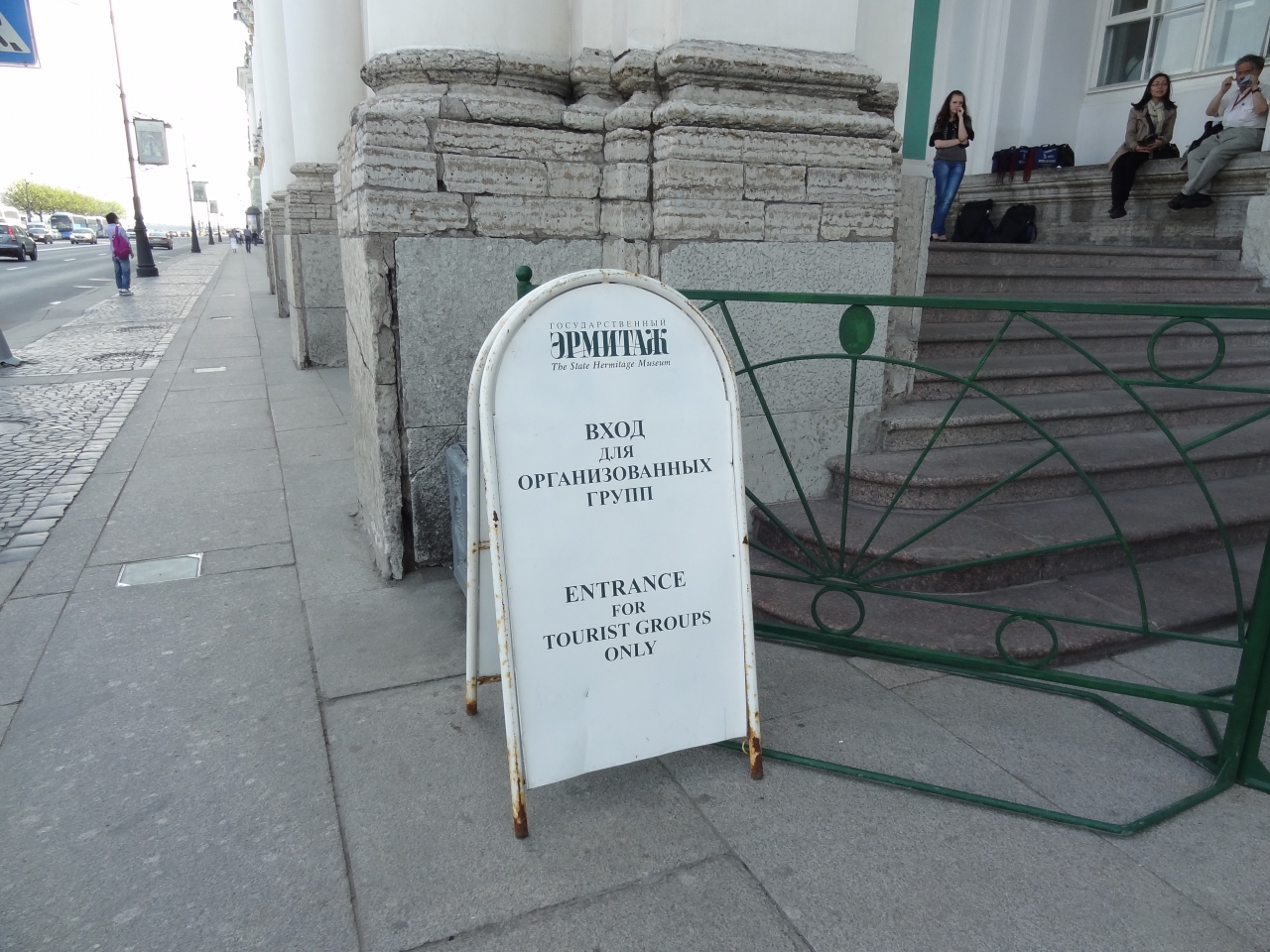 ツアーの団体客の入り口は、裏手のネヴァ川側にある。 因みに、夏の離宮ペテルゴフへの水中翼船の乗り場は、団体客の入り口と道路を隔てた反対側にある。