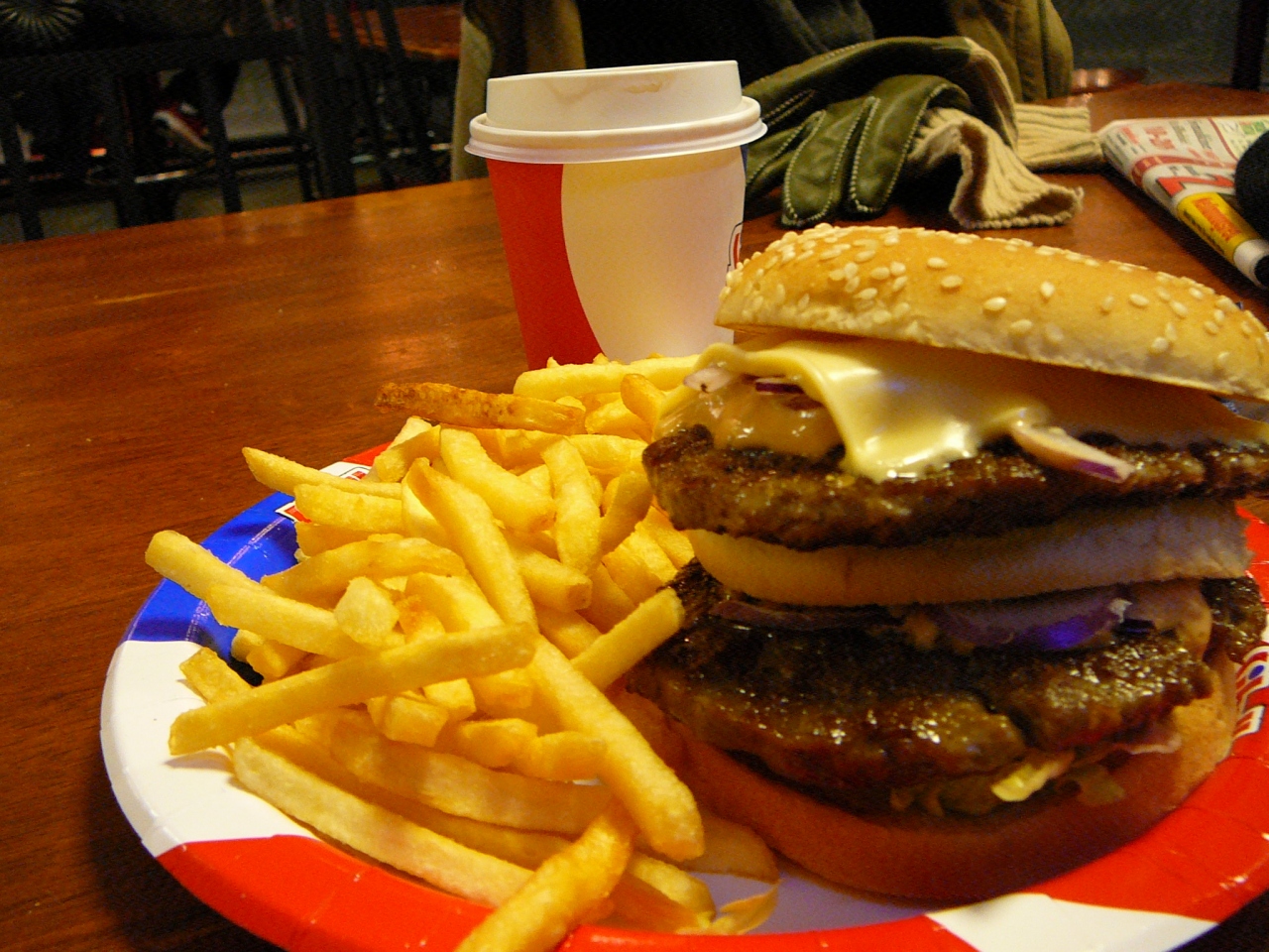 ハンバーガーはビッグマックの2倍くらいあるので、かなり食べ出があるし、ポテトも大盛りサクサクなので、日本円で約1000円も安い安い!