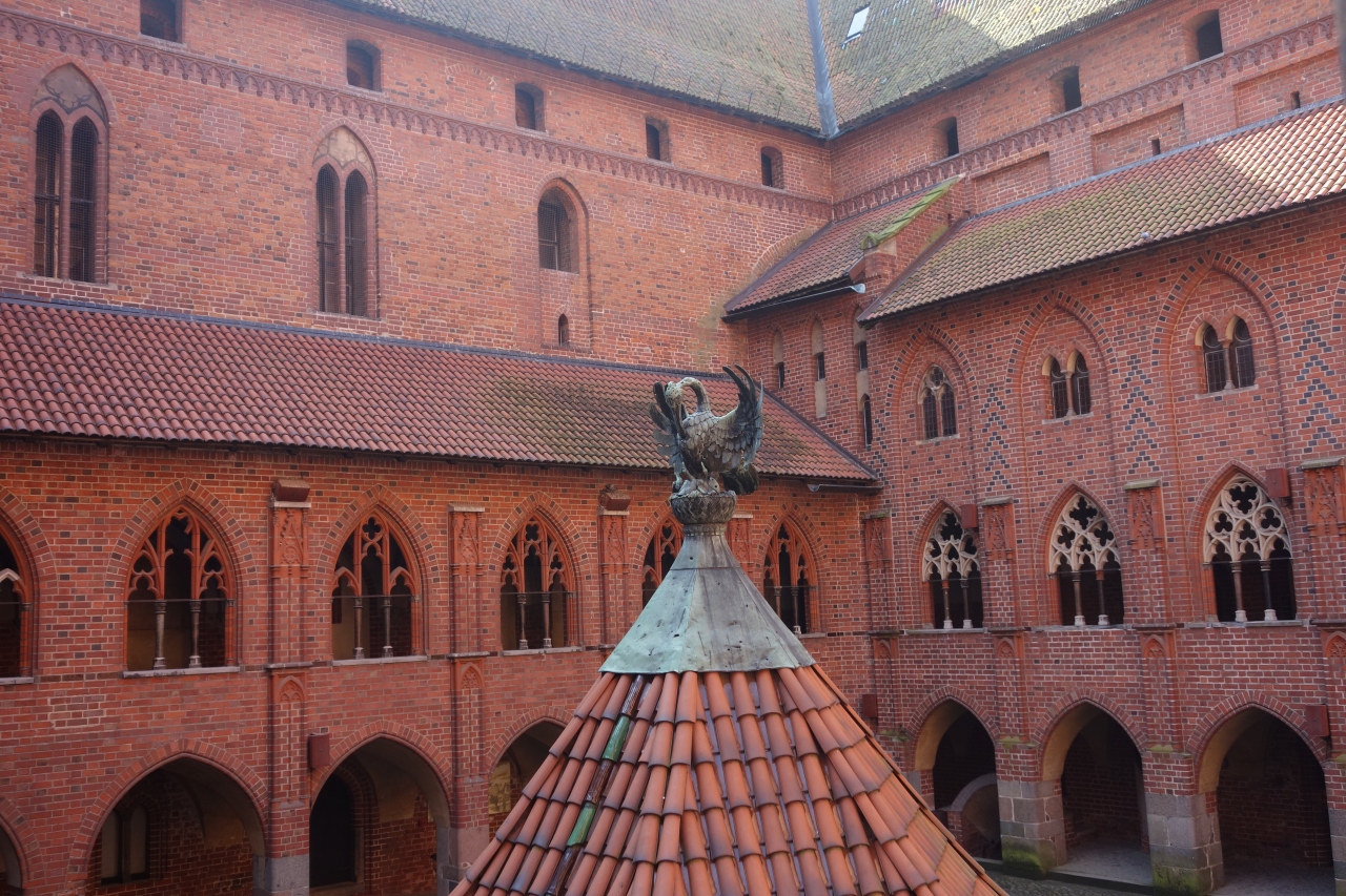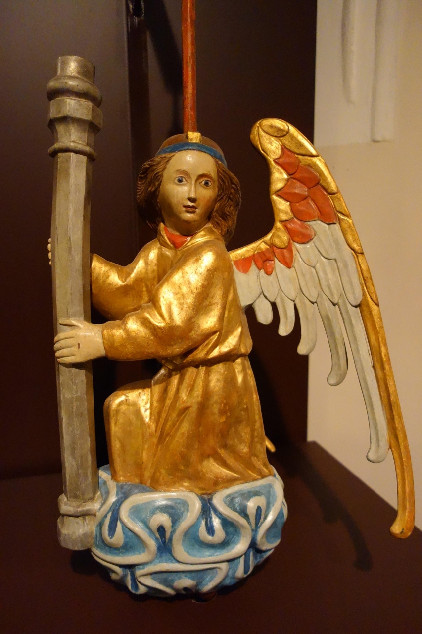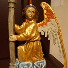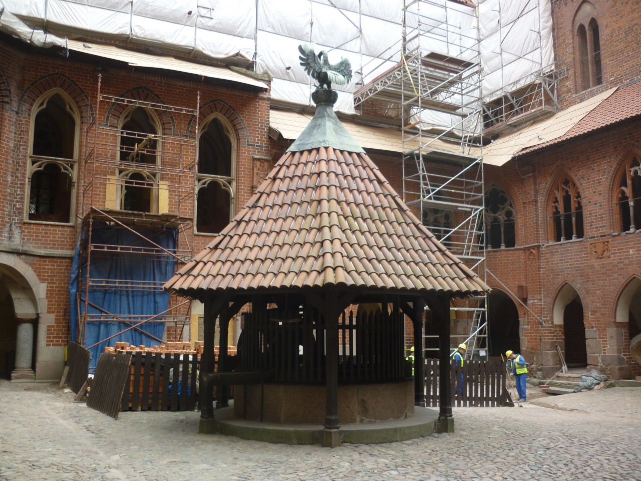 屋根つきの井戸の屋根の上にはペリカン像がいます。