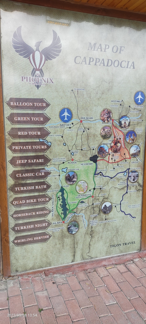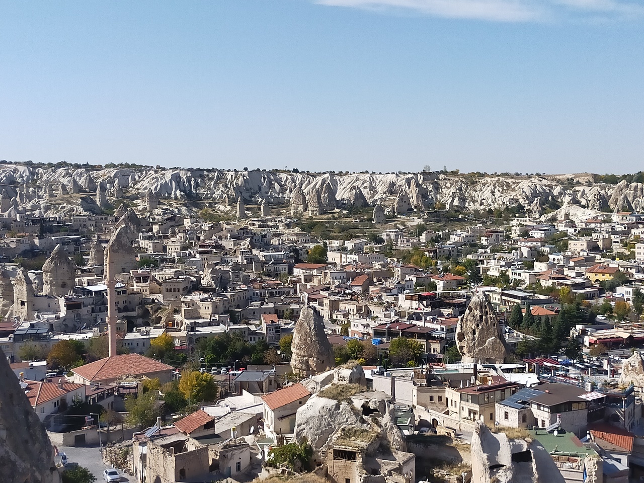 部屋やテラスからの眺めを考えるなら、ギョレメの中でもできるだけ高いところ(山側)に泊まるのがオススメ。眺めがいいです。地図を見て、ホテルが多い方が高くて、飲食店やレストランが多い方が低いです。(分かりづらいですが・・・)