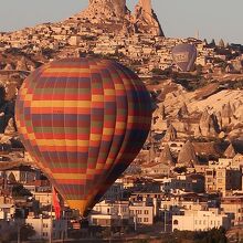 同じトルコツアーの方、2組がそれぞれ違う会社に申し込まれていました。気球会社の名前は忘れてしまったけれど、€130と€200でした。€200の方は記念写真付きでした。記念写真はなくとも、着陸後はシャンパンを振舞われ、自分達のカメラで写真撮り放題です。2組共、事前振込したと言っていました。1時間くらいのフライトで多分、内容はどこも同じだと思います。