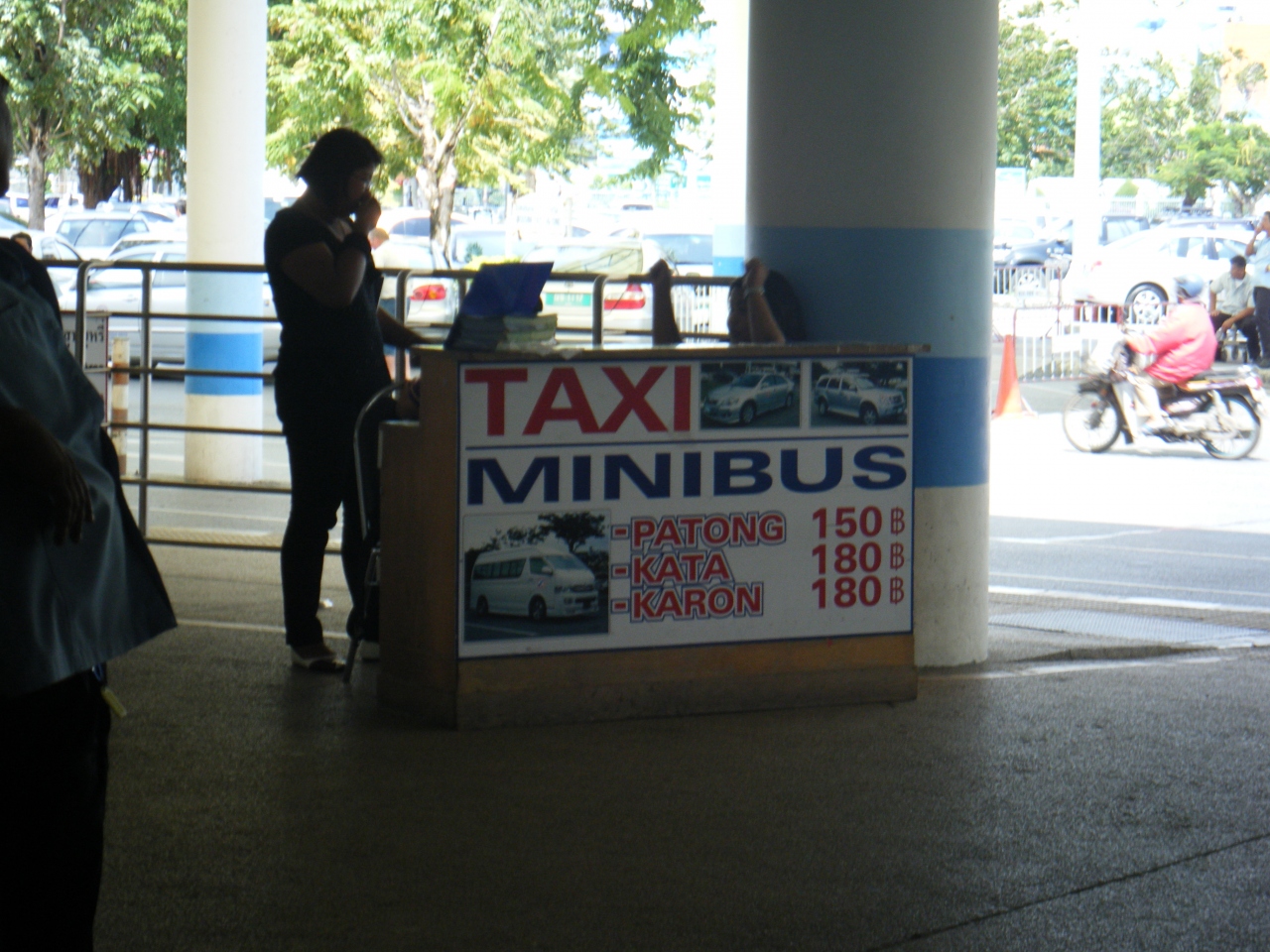 チケットの売り場は、国内線の到着ロビーと建物を出た写真の場所です。料金は、パトン150THB、カタ、カロン180THBです。ミニバスといっても10人乗りのワゴン車で席が埋まると出発です。飛行機到着時たくさんの人が利用しますので、すぐに席は埋まり出発です。