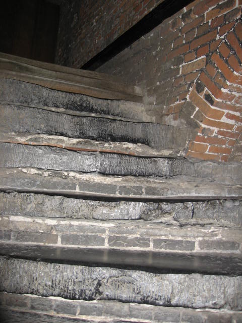 入口が分かりづらいのですが、鐘楼の真下の建物中央のアーチをくぐって中庭に進むと、2階のチケット売り場へと続く階段があります。 チケット売り場の脇に鐘楼の石段への入口があります。