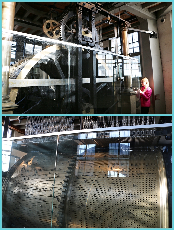 ドラムには122個の四角い穴が開いた列が250列あるので合計30500個の穴があり、メロディを奏でるためのピンがはめ込まれています。 このピンが外の37の鐘に繋がれたワイヤーに連動し、カリヨンの鐘が鳴る仕組みになっています。 目の前で巨大なドラムが回転し、カリヨンが鳴り響く体験はとても楽しいものでした。 是非その感動的な瞬間を体験してみて下さい。