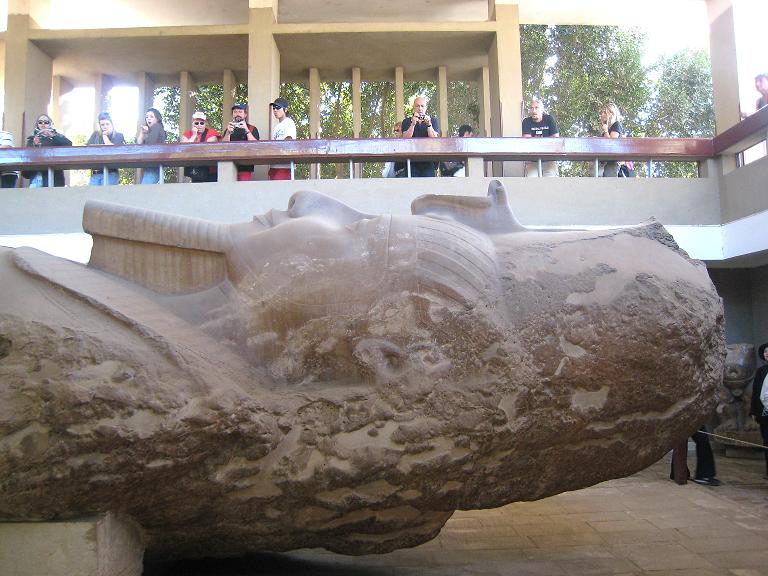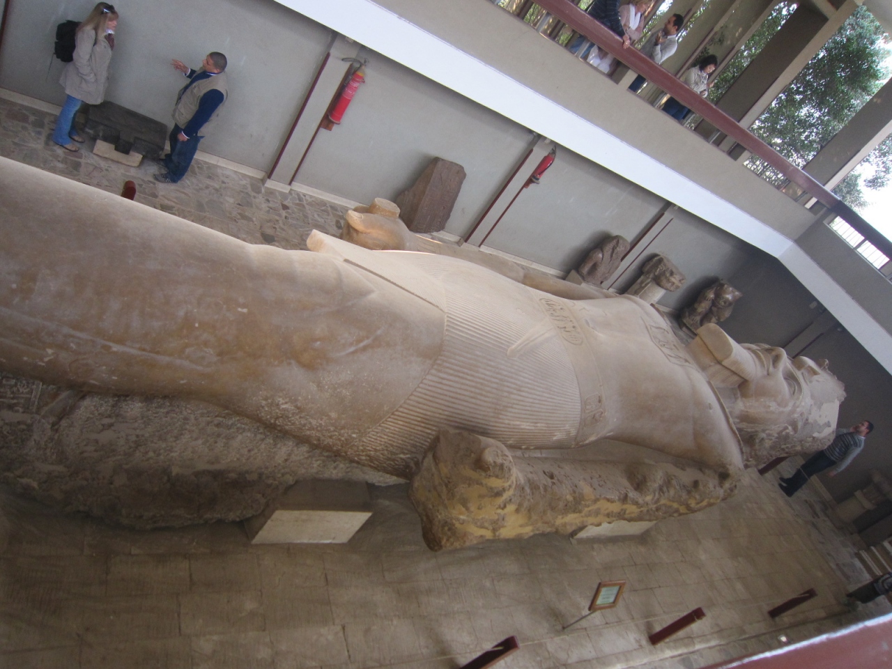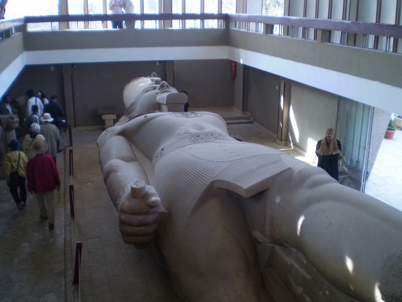 メンフィスは、カイロからナイル川の西岸を30Kmほど南に遡... 続きを読むった位置にあり、エジプト初期王朝時代の統一王朝最初の都となったところで国の中心として繁栄していたといいます。今は遺跡の入り口あたりに土産物屋が並ぶ程度の小さな集落でした。遺跡にはプタハ神殿跡やアラバスター(大理石の一種)のスフィンクス、聖牛アピスの解剖台などがありましたが、中でも横たわるラムセス2世の巨大な石像は身長が15mもあるそうで圧巻でした。これが立った状態だったというのだから想像してみるとすごいです。