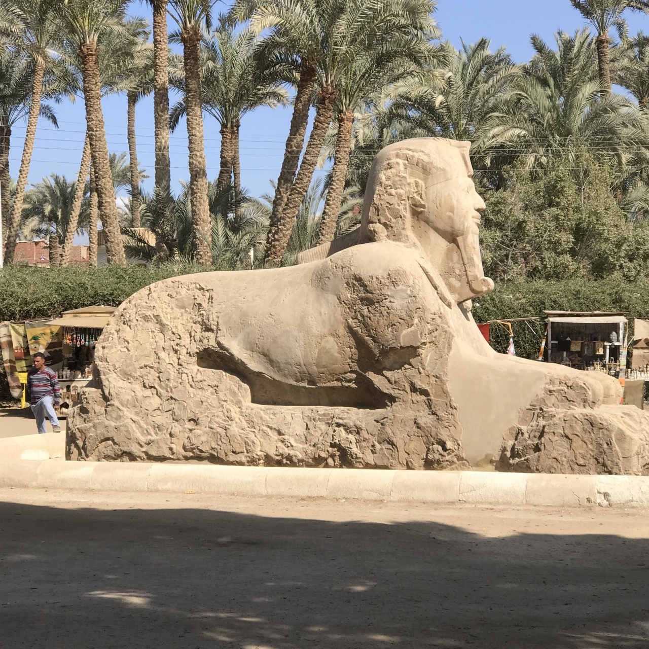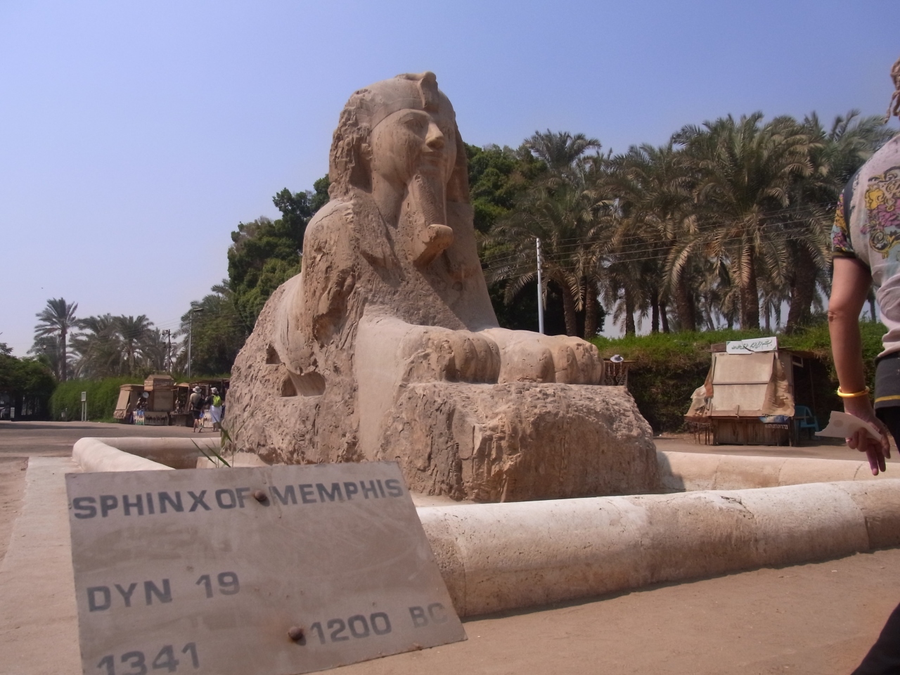 ギザのスフィンクスとは違って、大人なら背中に跨れそうな大きさ。顔立ちやひげもはっきり残っていました。右下の画像がメンフィスのスフィンクス。