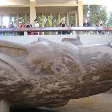 敷地に入ってすぐ右手にある建物内にラムセス2世像が保存されています。このラムセス2世像は元々はすぐそばにあるプタハ神殿前に立っていたのだそうですが、今では脚部分が失われているので、仰向けにした形で保存されていました。上の画像と左下の画像がそう。そばに写っている人と比べるとその大きさがよく分かると思います。