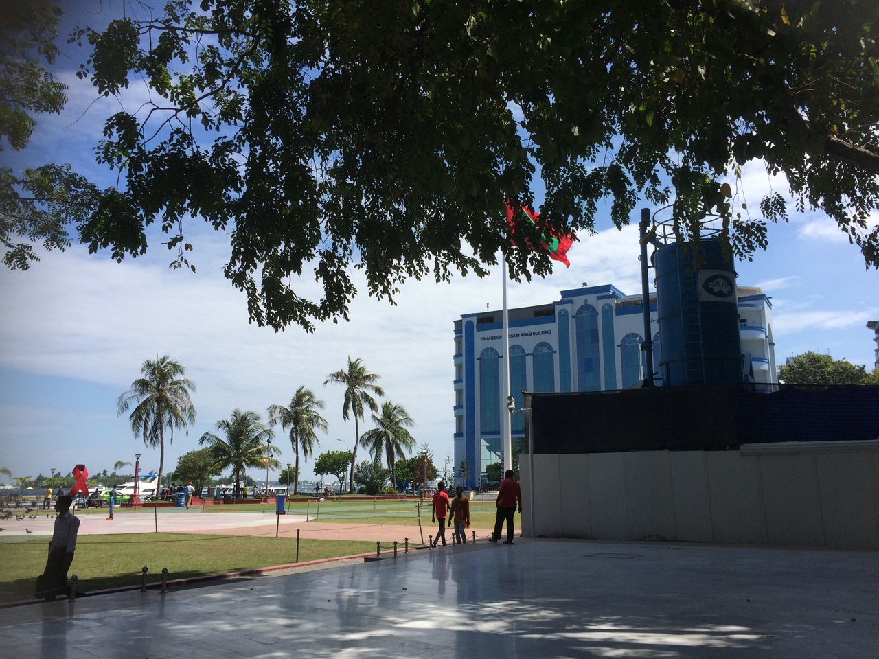 桟橋近くに大きな国旗がはためく、大きな広場。 国旗の後ろの建物は青白で目立つ。なんの建物か不明です。 風が通り... 続きを読む抜けて、暑いモルディブで気持ちのよい場所です。 ウォーターフロントの公園なので、時間があれば、船を眺めることができます。 閉じる