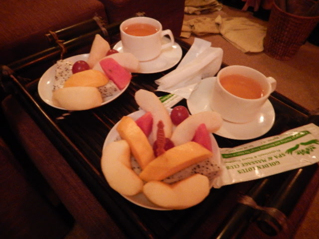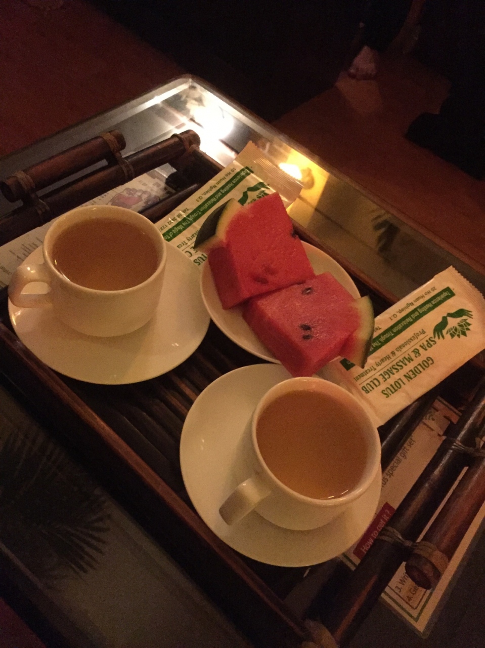 店内の雰囲気はオシャレでなかなかいいです。ウェルカムドリンクのお茶とスイカをいただきましたが、美味しいです~。施術後にもお茶とココナツのお菓子が出されます。これも美味しい。