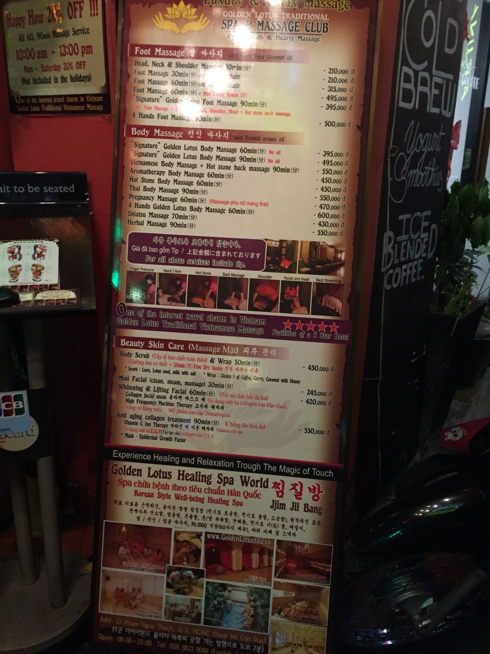 午前中に行くと、ハッピーアワーということで20%オフ、90分のフットマッサージを... 続きを読む30万ドン(1500円)で受けられました。