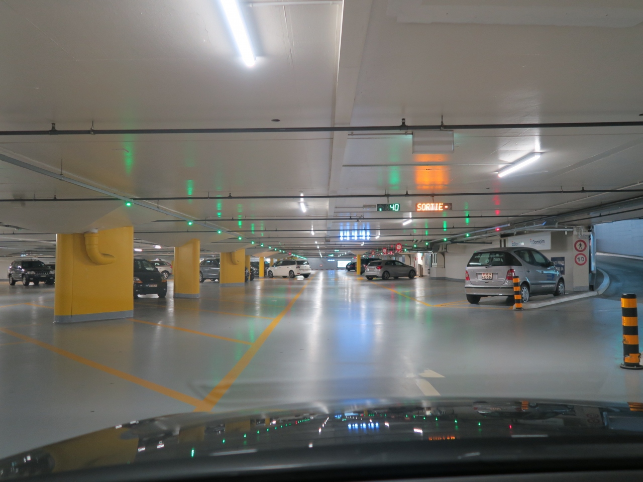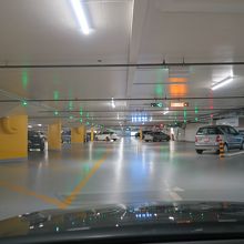 この駐車場は、駐車枠は斜めに停めるようになっており、そして横幅が広めなので、ストレスが少ない。また、混雑している時でも、天井に開きのランプ(緑)が点灯しているので、場所を探すのに楽。