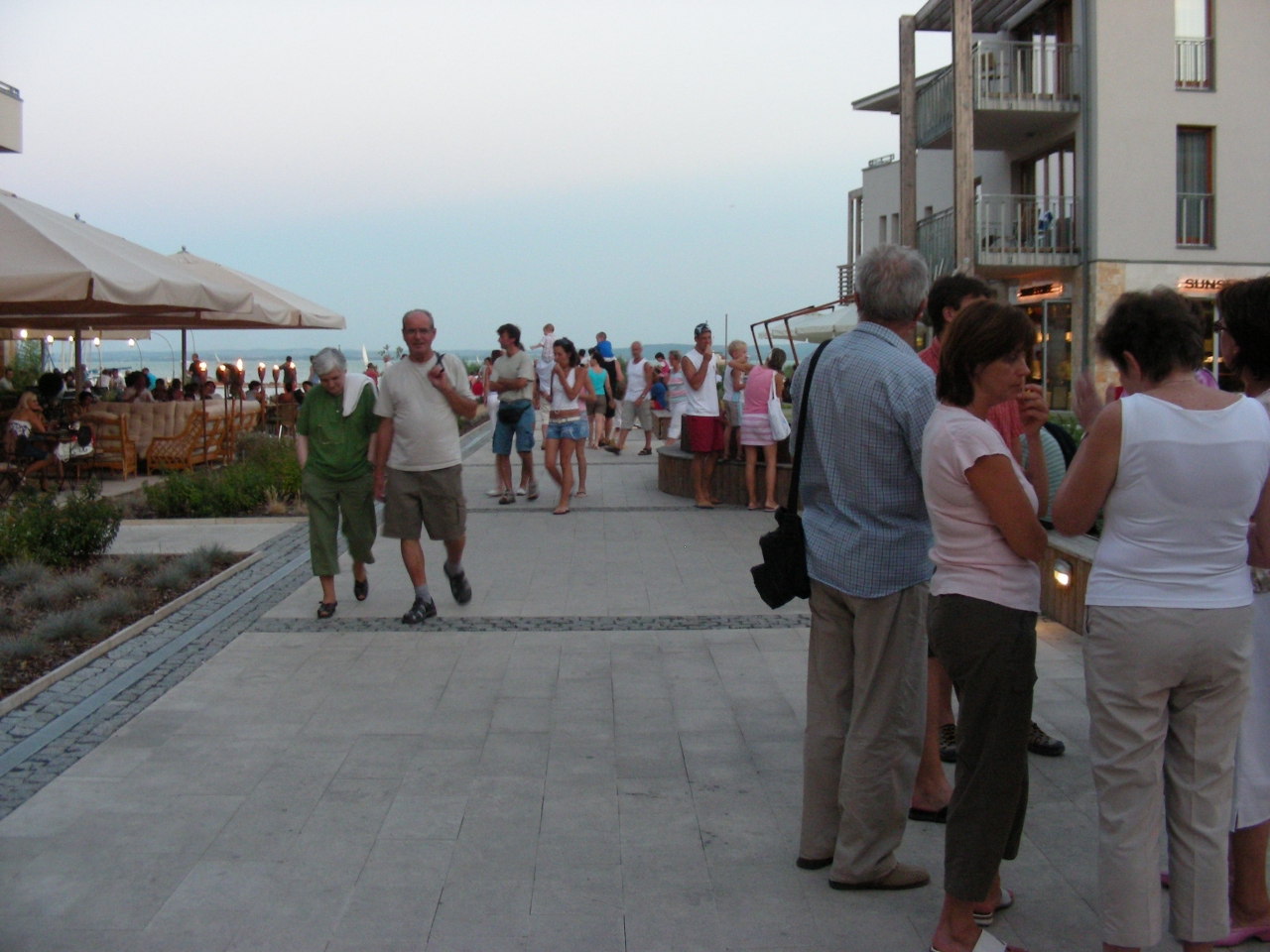 ライトアップされたミニ噴水、目の前に広がるバラトン湖。オシャレなのに心地好い雰囲気が漂うのは、ファミリー連れが多いからでしょうか。