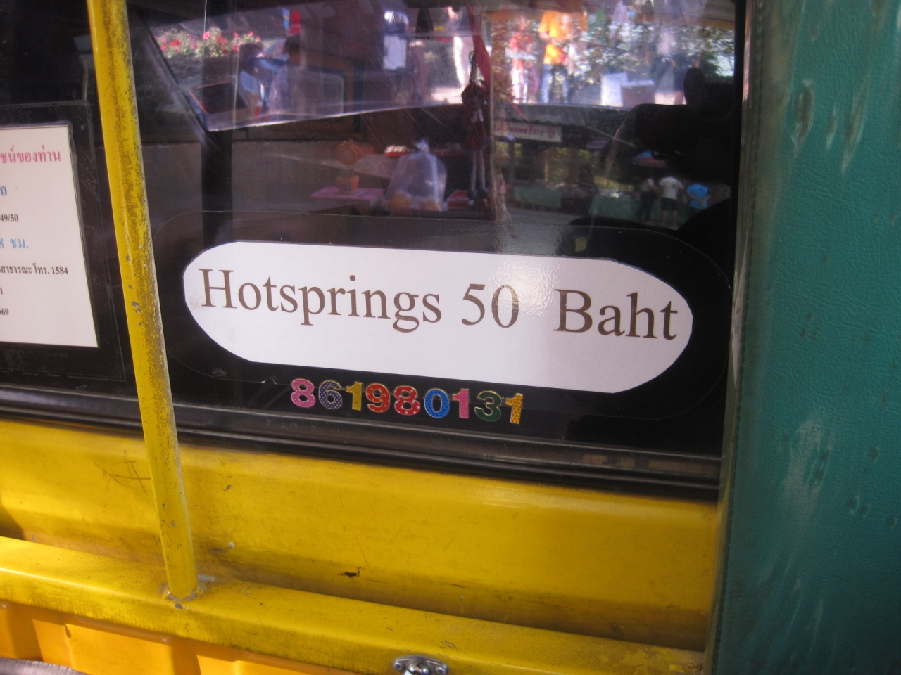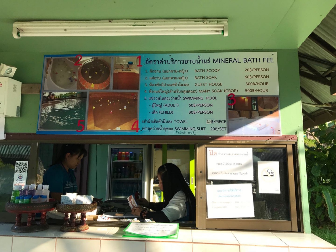 入口のゲートで入場料を支払い 道沿いに進み右前方に売店と奥に源泉の湯煙が、見えてきたら分岐を左に進みます。すぐに左の奥にカ... 続きを読むウンターのある建屋が、貸切温泉の受付です。グレード別の料金の様でしたが、一番安い建屋でも充分な広さでした。たしか800バーツだったと思います。中には、シングルベットが2台とエアコン 冷蔵庫 テーブル ソファーが、あり 裏の窓を開けると川があり風が吹き抜け気持ちがよかったです。源泉は、湯の花が混入していて一見 汚くみえますが、泉質がよく温まります。持ち込んだゆで卵とビールで乾杯して読書しながら1時間ほどぬるめの湯につかり ベットで読書しながら半日すごしました。全体的には、あまり清潔とは、いえませんの神経質な方にはおすすめしません。 閉じる