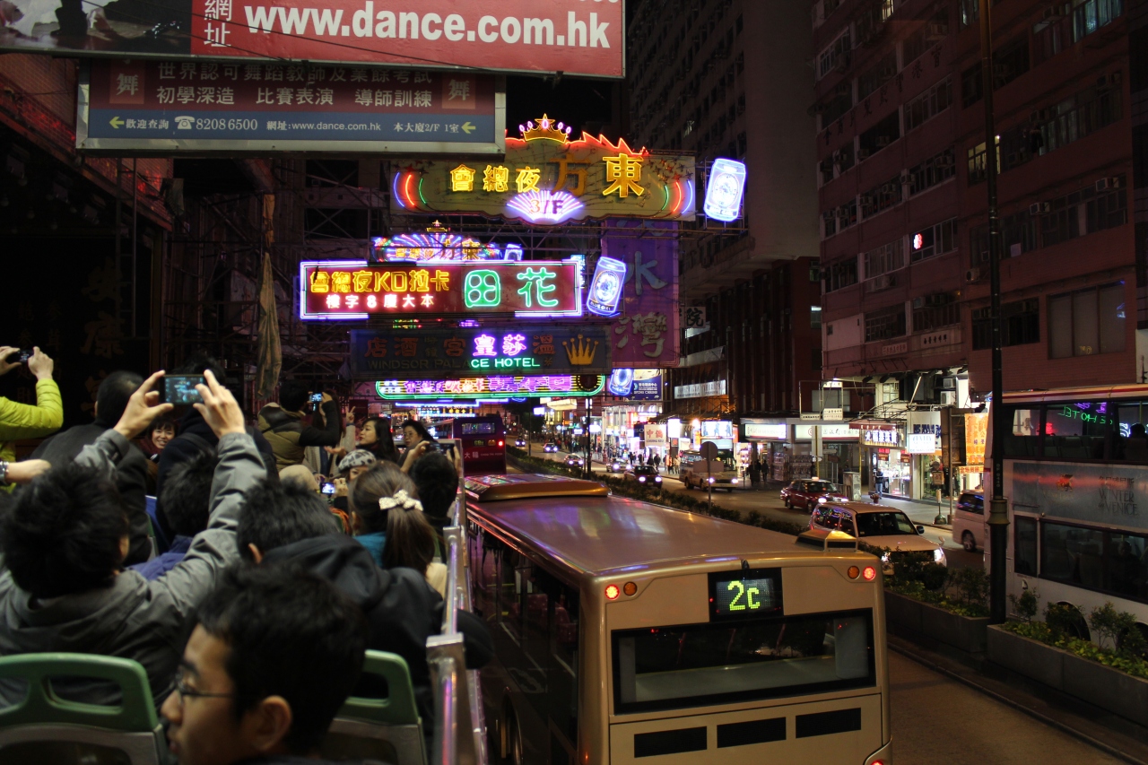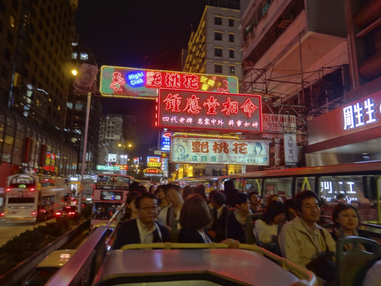 JTBのオープントップバスはDFSギャラリアチャイナケム店(2015年4月からはインターコンチネンタル・グランドスタンフォードホテルに変わるようです)集合 ⇒ 尖沙咀の海岸線 ⇒ ネイザンロード北上(佐敦の辺りで写真撮影タイムのため停車) ⇒ 油麻地周辺の下町 ⇒ 女人街(下車・自由時間、ここで解散可) ⇒ ホテルへ送迎 というコースで大体オープントップバス乗車時間が30分位、女人街散策が30分位という感じです。この他にもディナー付きのコース、ディナークルーズ付きのコース、ビクトリアピークにも行くコースなど、いくつかのコースがあります。途中、トンネルを通る際は頭がぶつかりそうな感じでちょっとしたジェットコースター気分が味わえます。メインはやはり手が届きそうなネイザンロードのネオン看板でしょう。決して安くはありませんが、香港に来たら一度は体験してみるのもいいと思います。 閉じる投稿日:2015/02/12