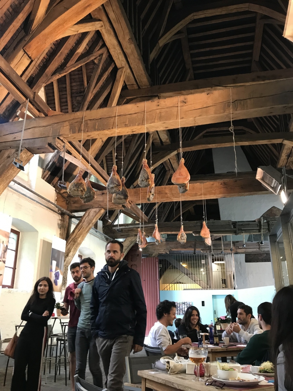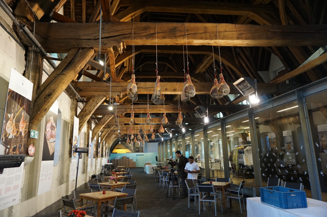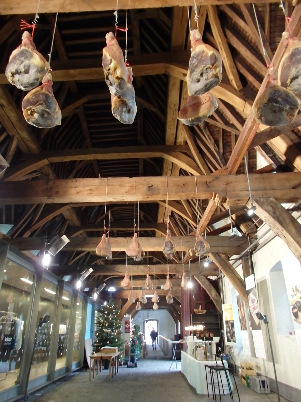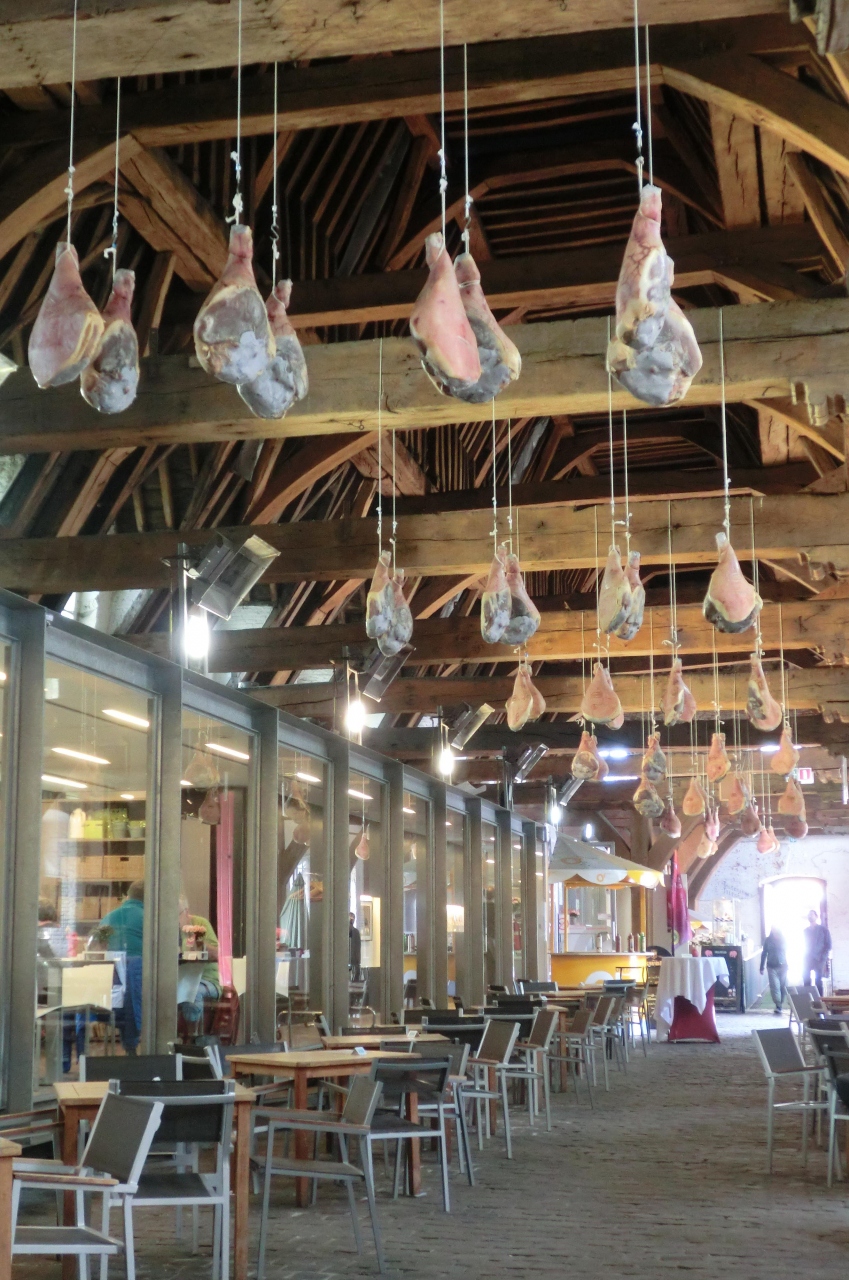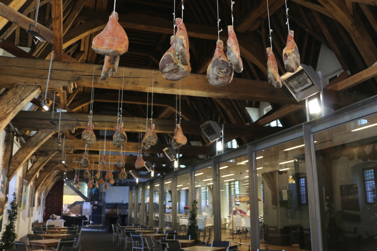 梁に吊るされている生ハム(レプリカ)が中世の雰囲気を醸し出しています