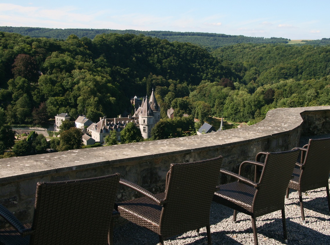 絶景ポイントからはデュルビーの町や町を囲む森が一望出来て椅子もあります。