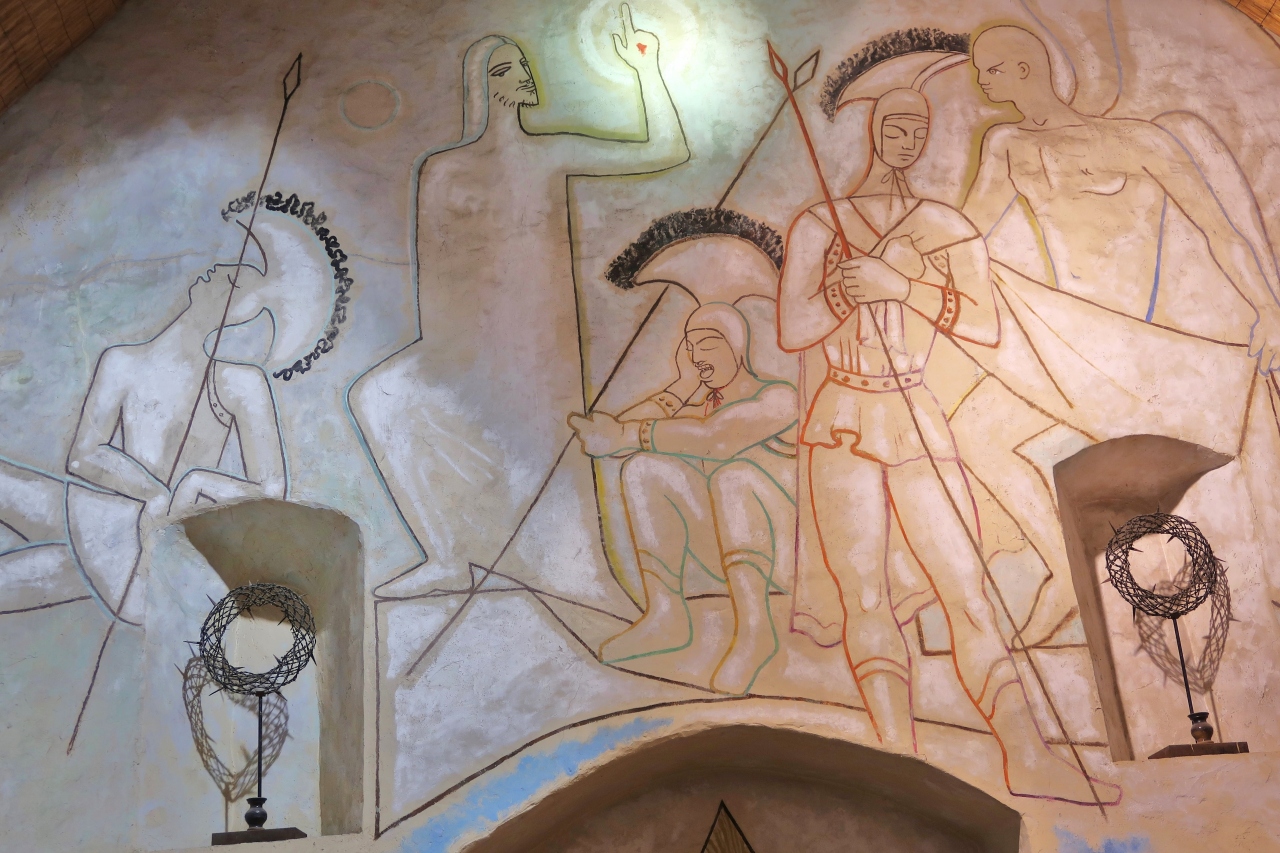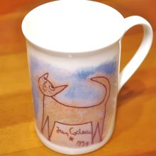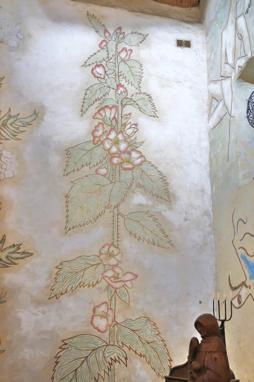 正面の祭壇には、荊の冠をかぶったイエス、燭台も熊手でできています。その上には、居眠りするローマ兵に囲まれ、天使に見守られながら、得意そうな表情で復活するキリストが描かれていました。側面の壁には、天井まで伸びる薬草が花を咲かせています。入口の薬草の下には、黄色いぶち猫が大きな目を見開いて描かれていました。ギフトショップでは、この可愛い猫の絵葉書とマグカップを購入しました。