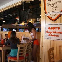 フーターズガールが注文をメモった紙を天井に吊るしてあるワイヤーに掛け、厨房めがけてガーっと投げるパフォーマンスも笑いました。