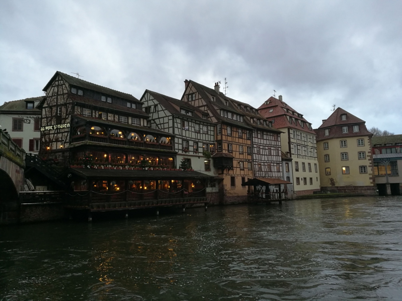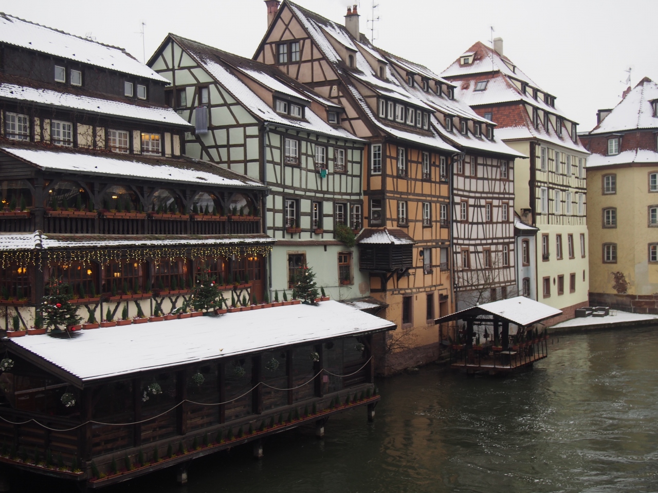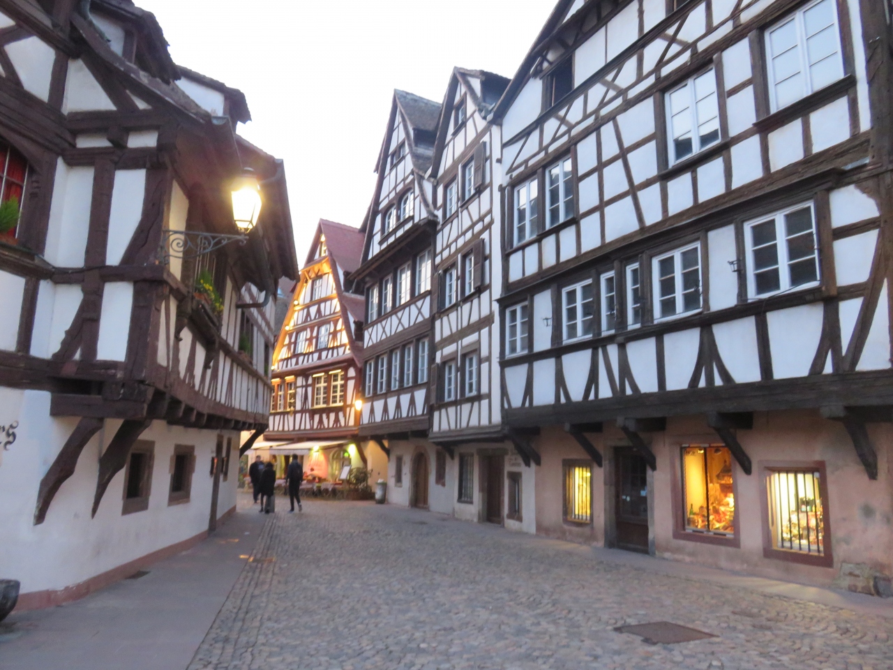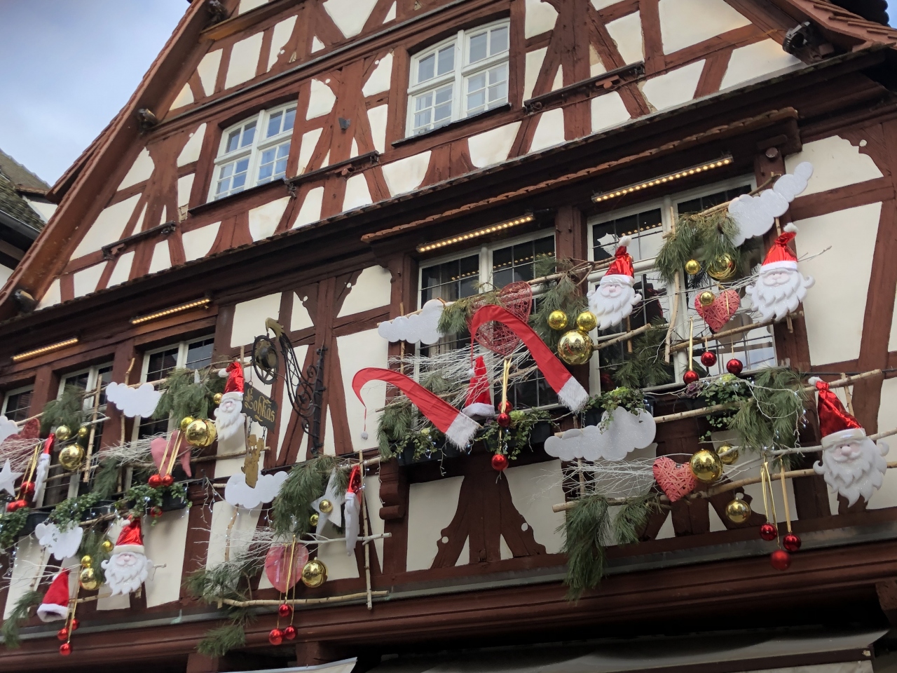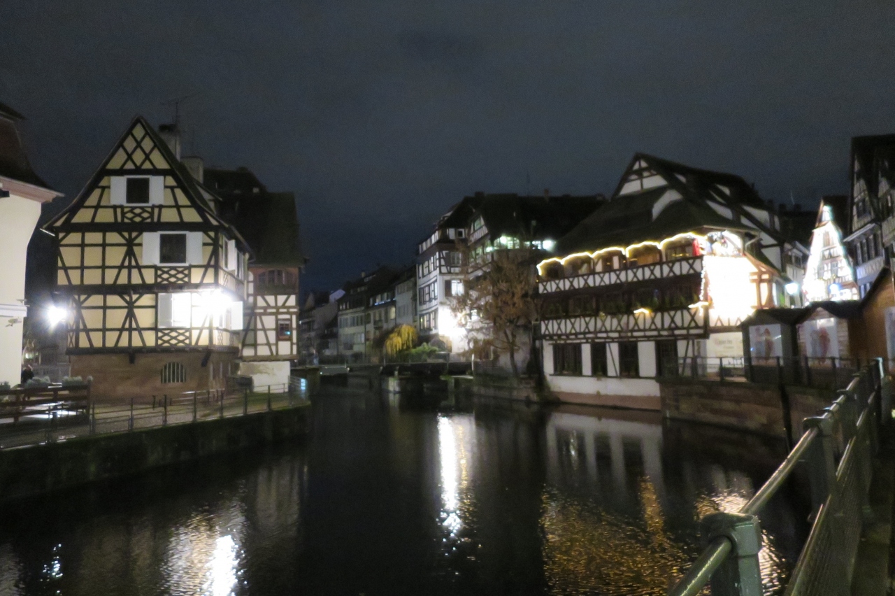 クリスマスの時期は「ベンジャミン・ジクス広場(Place Benjamin Zix)」の周りに屋台が少し並びます。写真によく登場する木組みの家々のライトアップは地味でしたが、周辺のレストランのイルミネーションを楽しめました。