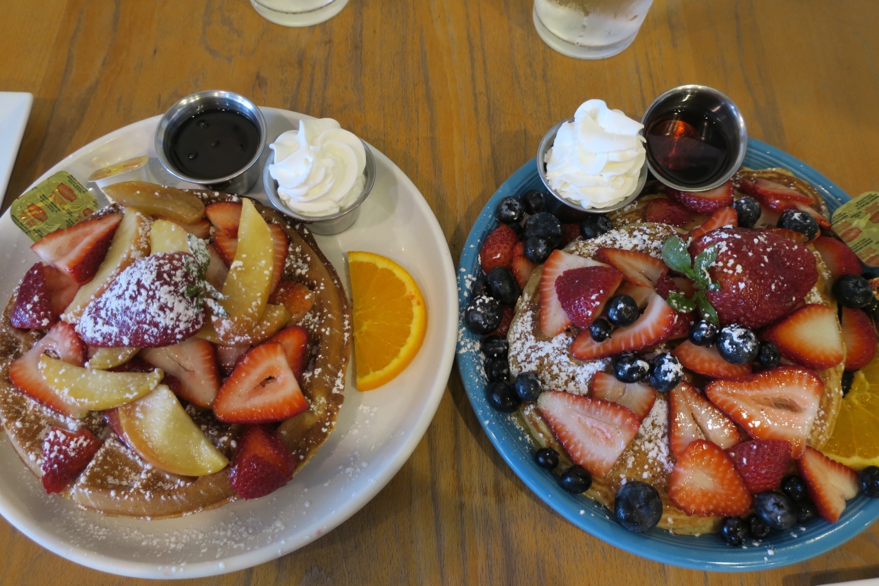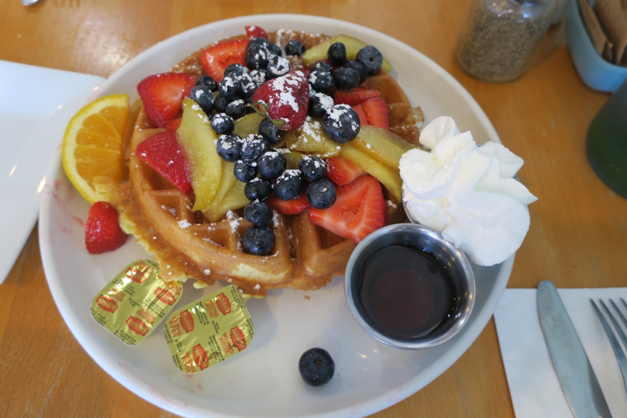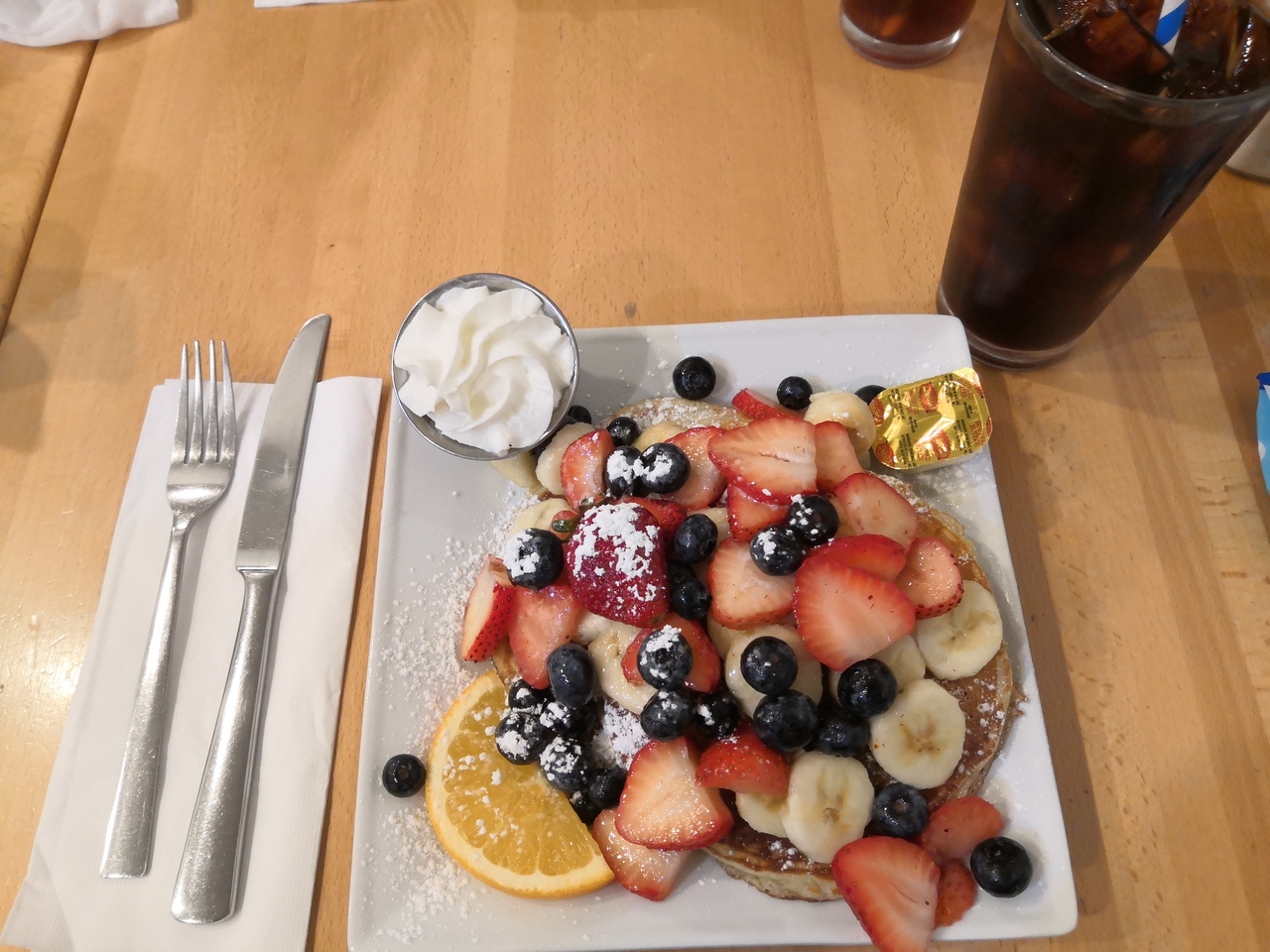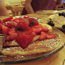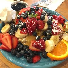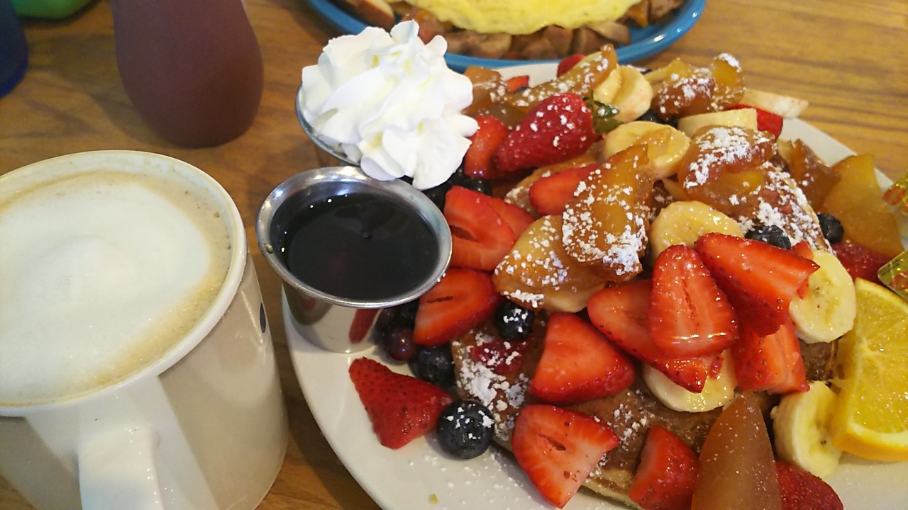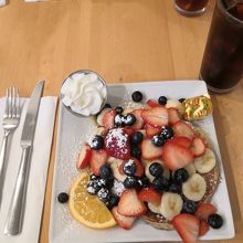 パンケーキとワッフル、それぞれフルーツ全部乗せをオーダーし、家族の女子メンバーでいただきました。見た目も華やかでかわいらしく、味も特別ではありませんがそれなりにおいしく楽しめました。ワッフルの方がおいしかったと思います。