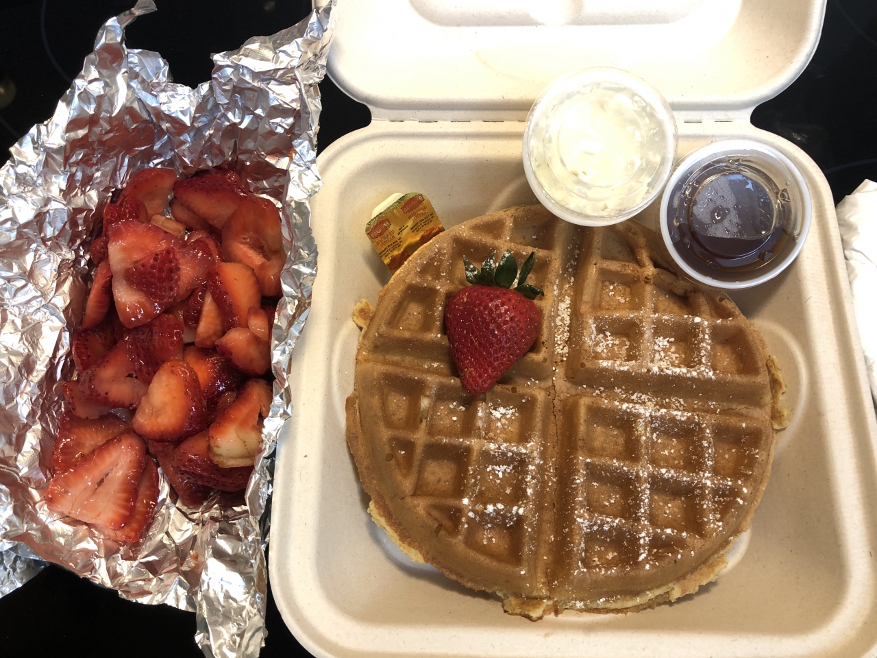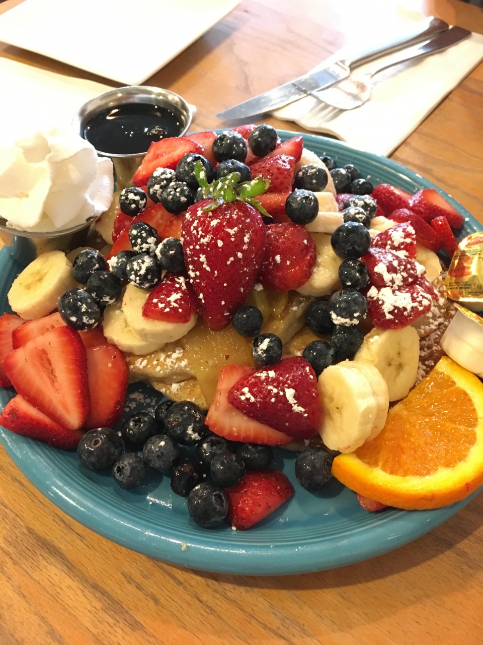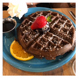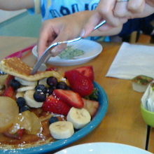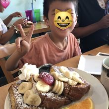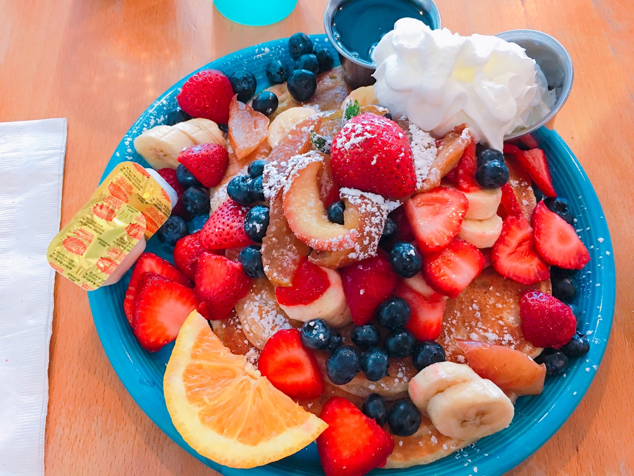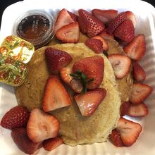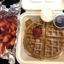 パンケーキとワッフル、それぞれフルーツ全部乗せをオーダーし、家族の女子メンバーでいただきました。見た目も華やかでかわいらしく、味も特別ではありませんがそれなりにおいしく楽しめました。ワッフルの方がおいしかったと思います。