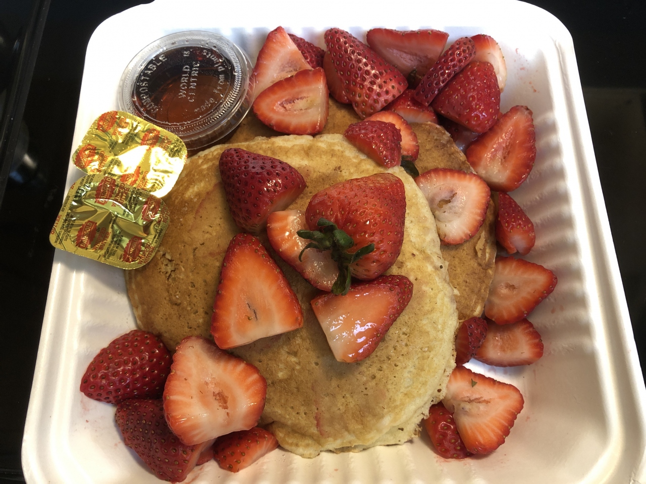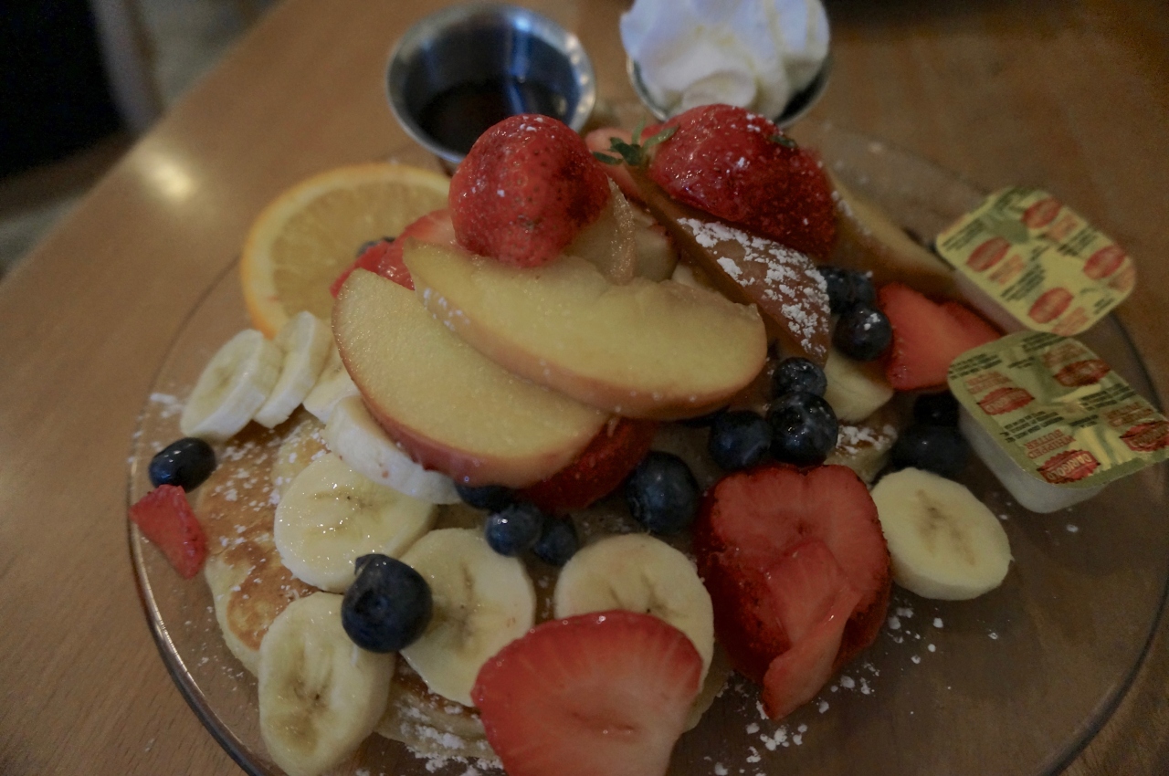 パンケーキ($9.75)にフルーツオールトッピング($10.50)でフルーツのが高いけど、見た目も豪華でテンションあがるし、煮詰められた?リンゴもとても美味しいのでおススメです。前回2回ワッフルを食べたのですが、すごくモチモチサクサクで美味しかったです。もちろんパンケーキのほうもフワフワで何も付けなくても美味しかったです。