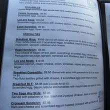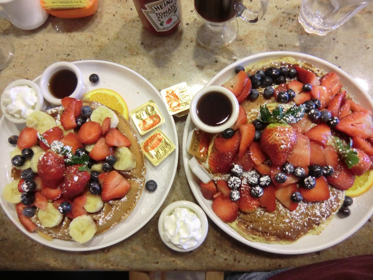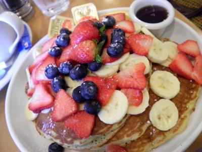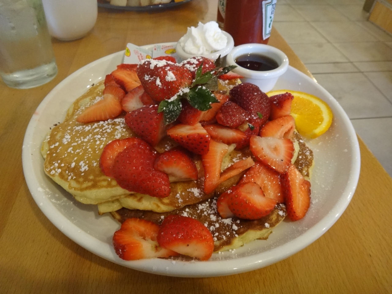主人のオーダー、パンケーキのコンボ。ベーコンと卵が付いてた。このパンケーキもかなり美味しかった!玉子の焼き方を聞かれたけど、唯一知っている「サニーサイダップ」とお願いしました。半熟でした。ちなみにスタッフとの会話は英語のみです。