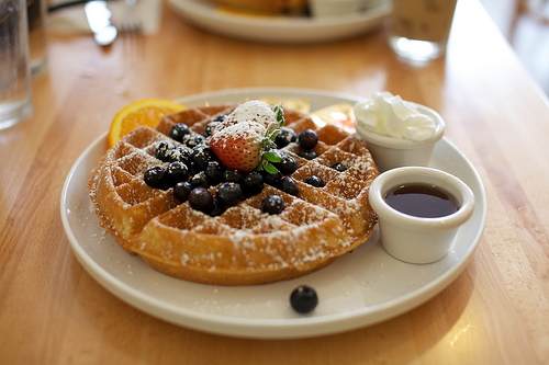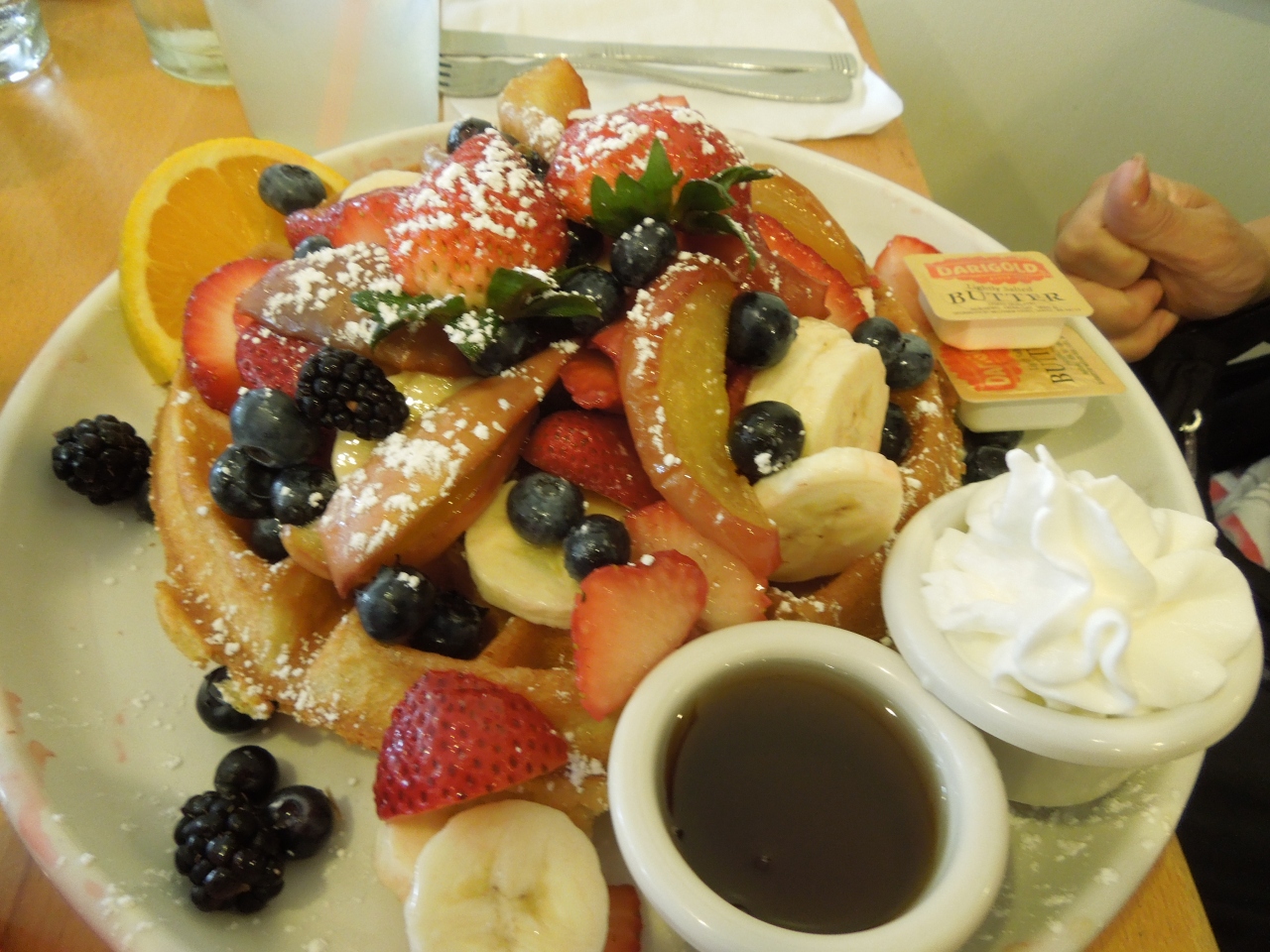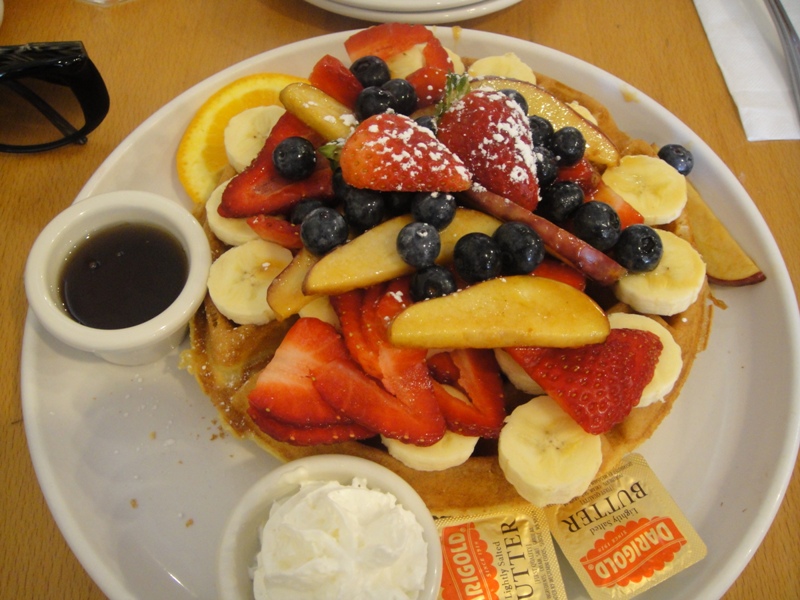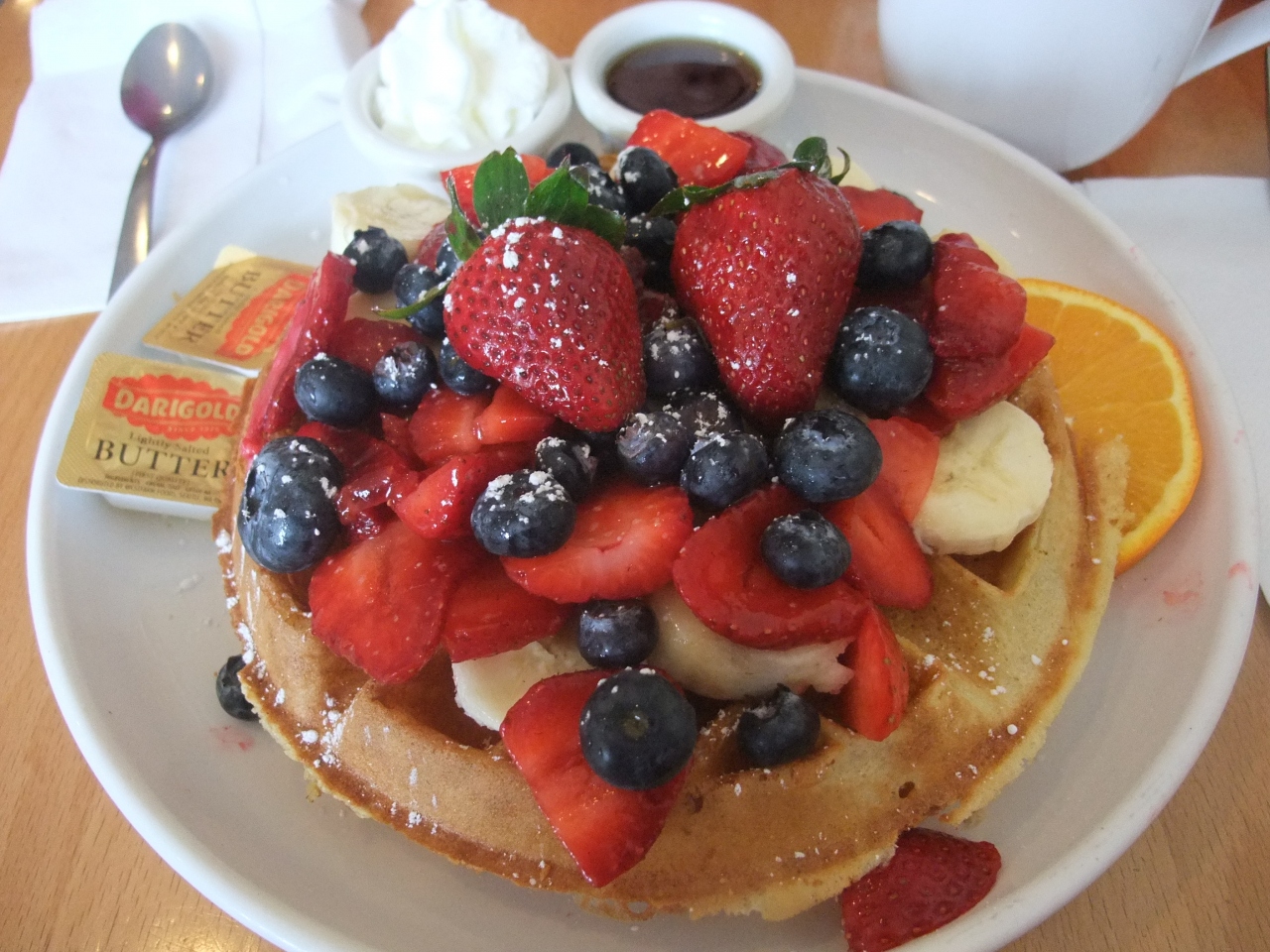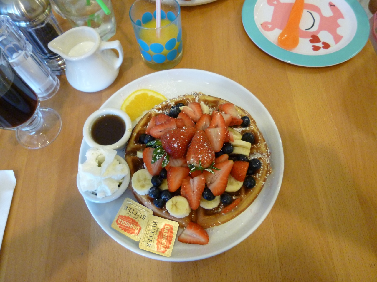 30分くらいでやっと入れました。僕がオーダーしたのがプレーンワッフルにブルーベリーのせ。他にトッピングがストロベリー、バナナ、焼いたリンゴ?がありました。各1.5ドルで追加できるようです。