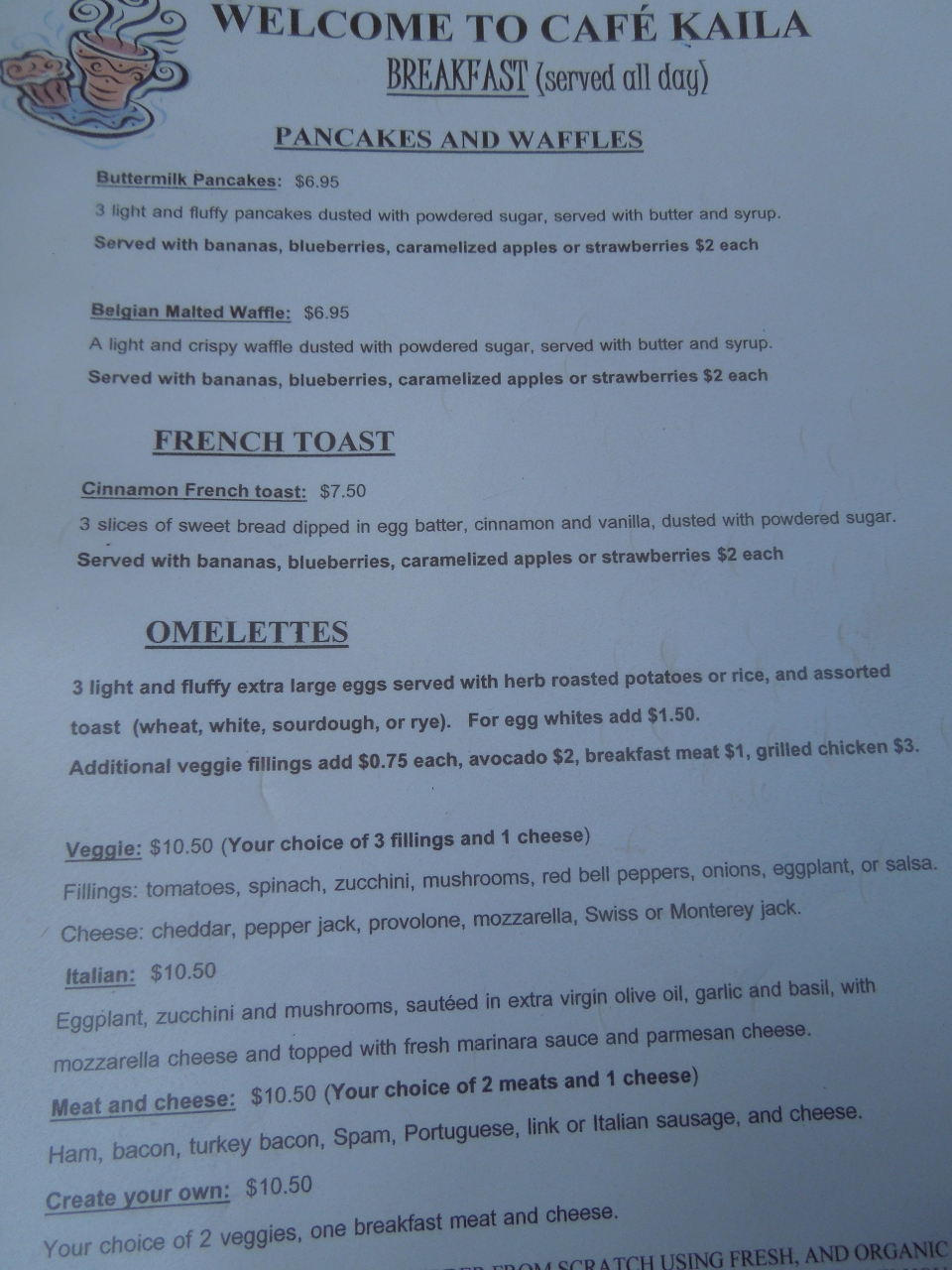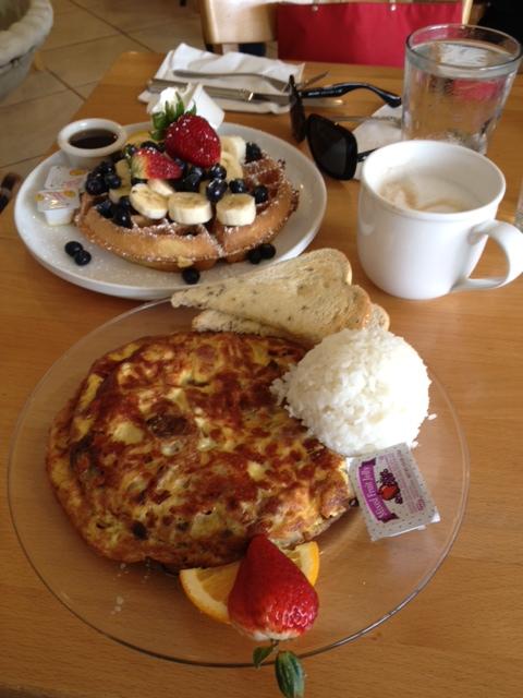 私はワッフルにフルーツ全部をトッピング、夫はベーコン&スパムのオムレツを頼みました。
