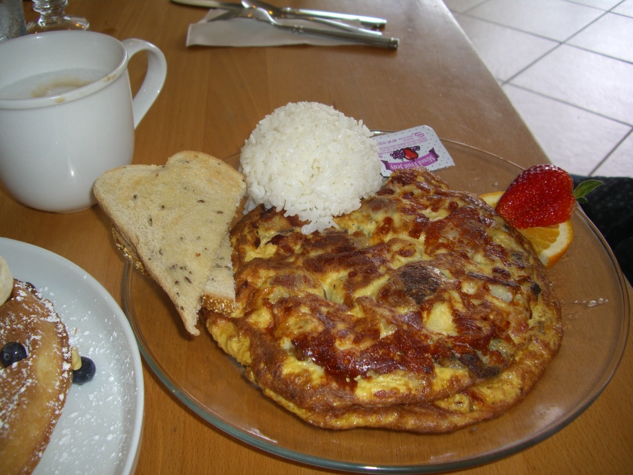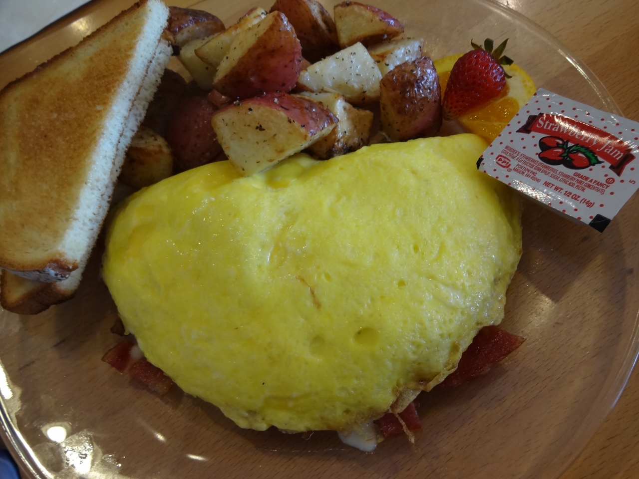 オムレツもベーコンとスパムがたっぷり入っていて、付け合わせのポテトもほくほくで美味しかったです。