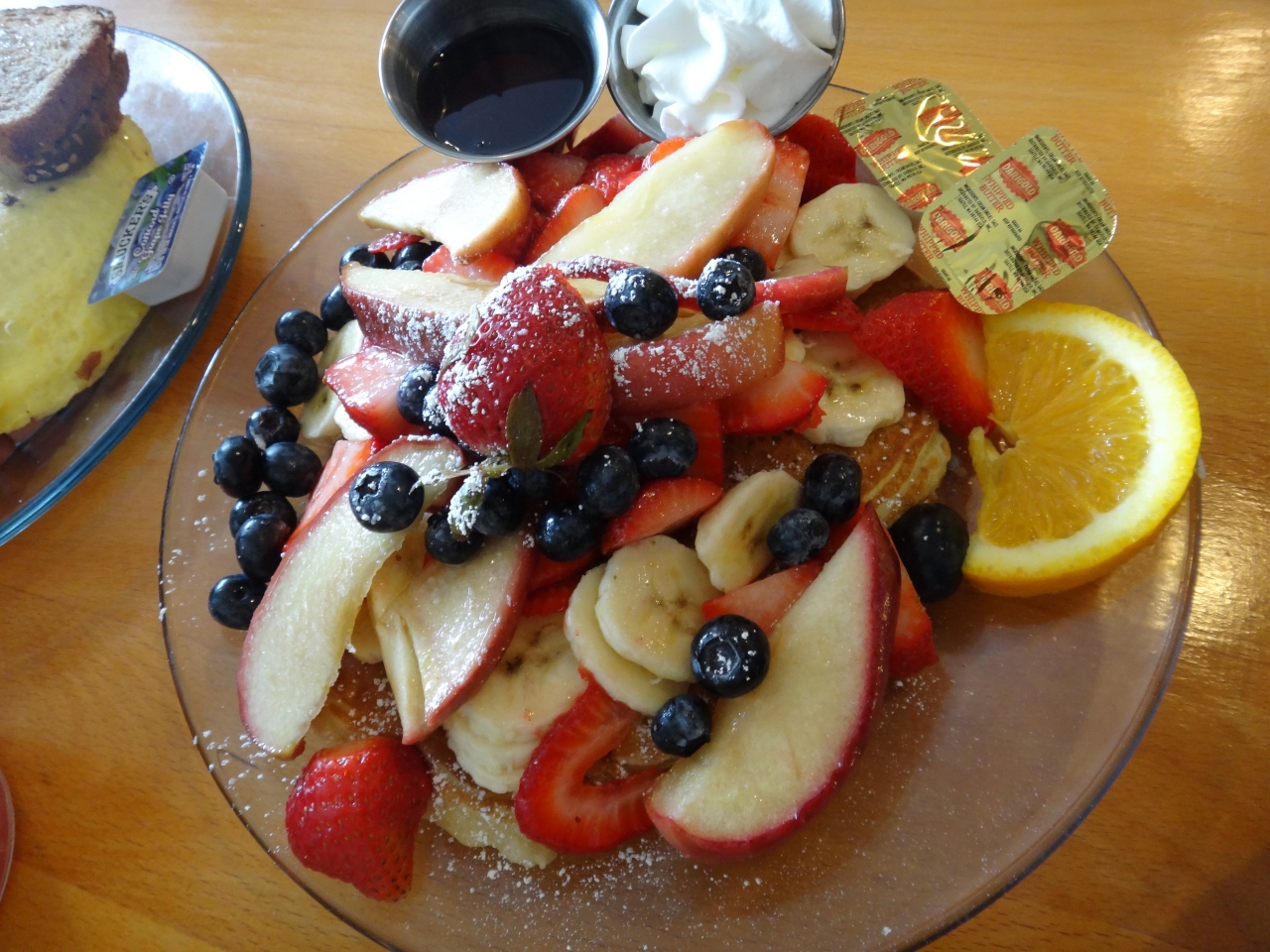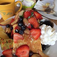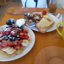 パンケーキはフルーツを乗せているので、生地が水分を吸ってしみしみな感じ。
