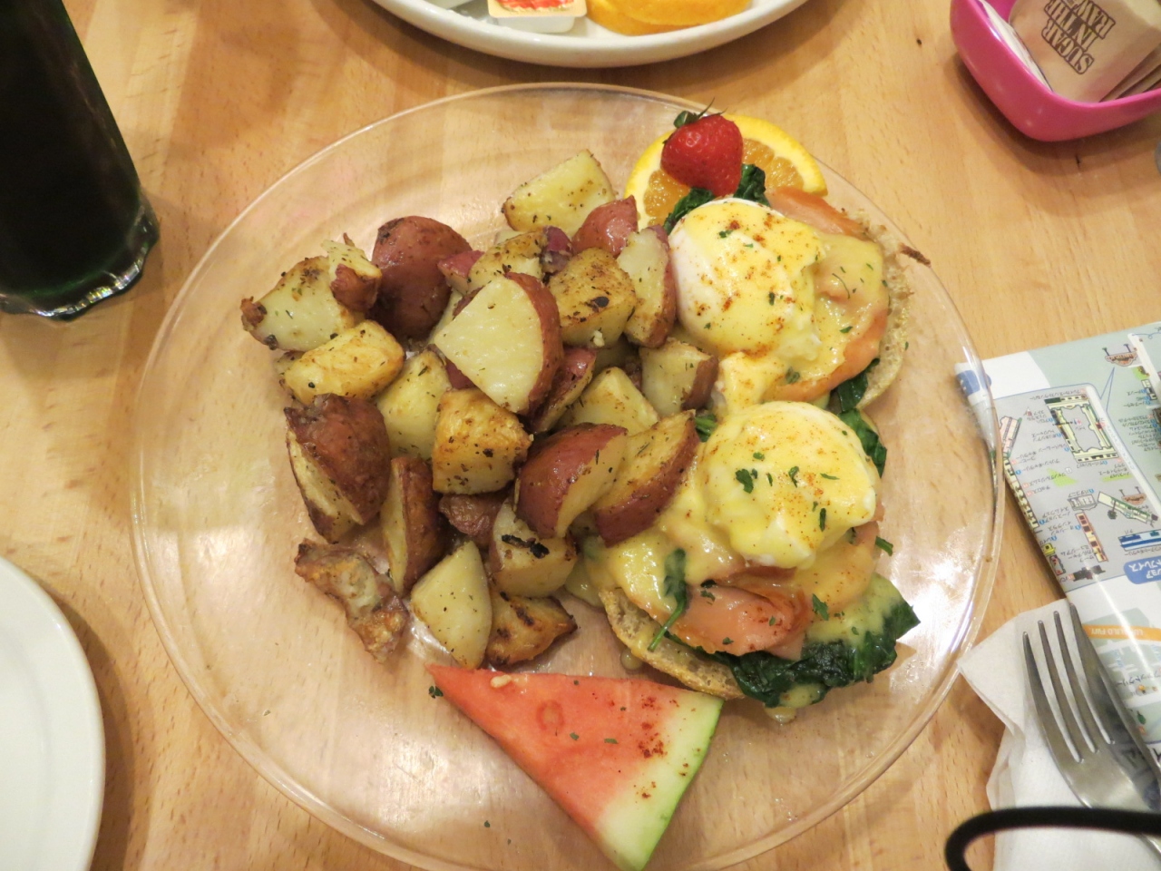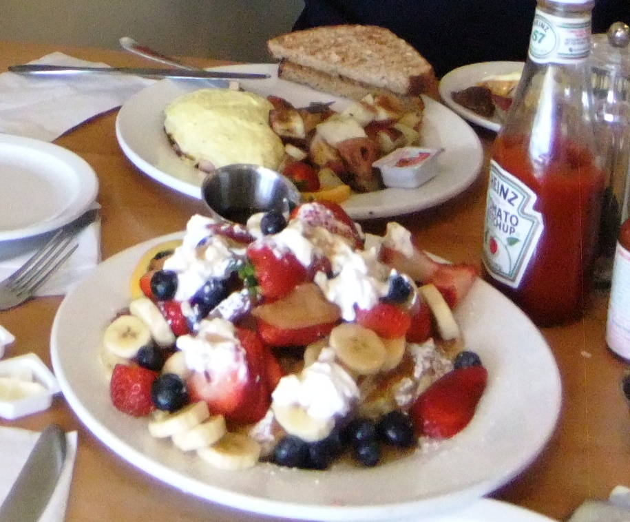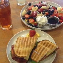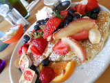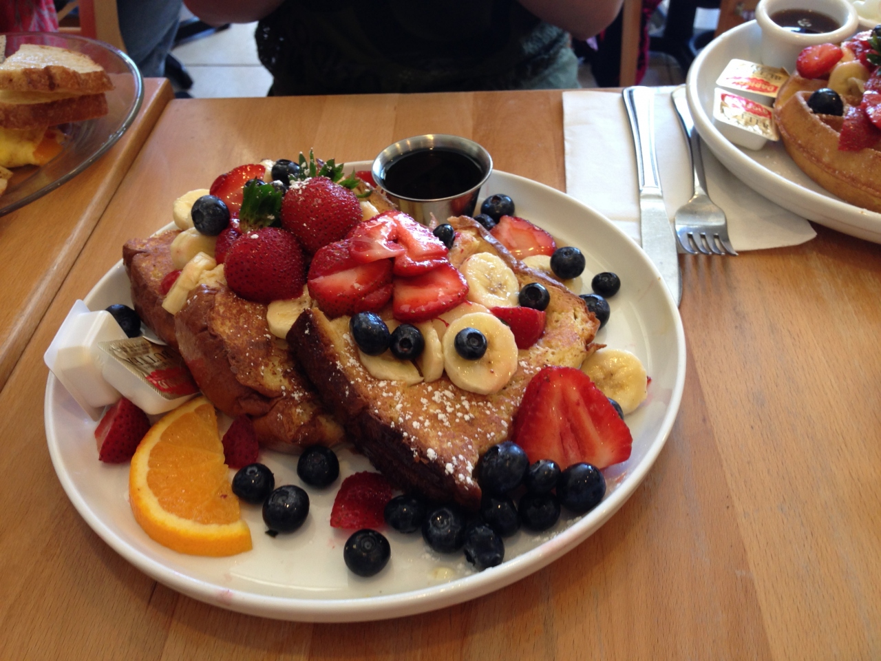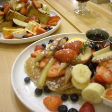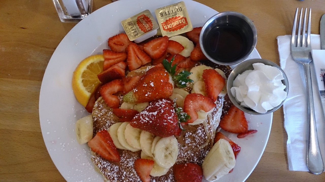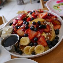 お昼時間になっていて、待つことなくすんなり奥のテーブルに通されました。パンケーキとフレンチトーストをそれぞれオールフルーツトッピングで注文し、私はパンケーキを食べました。フルーツの量があってお腹いっぱい。甘さはパンケーキのほうがあるけれどトーストのほうがボリュームがありました。その日初めての食事でしたが完食はちょっと無理でした。