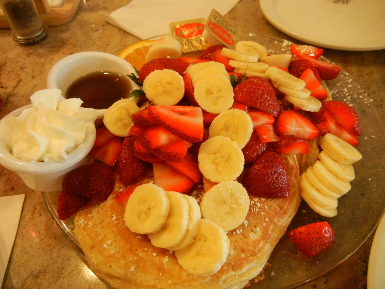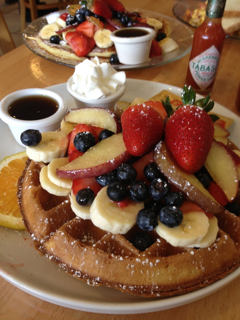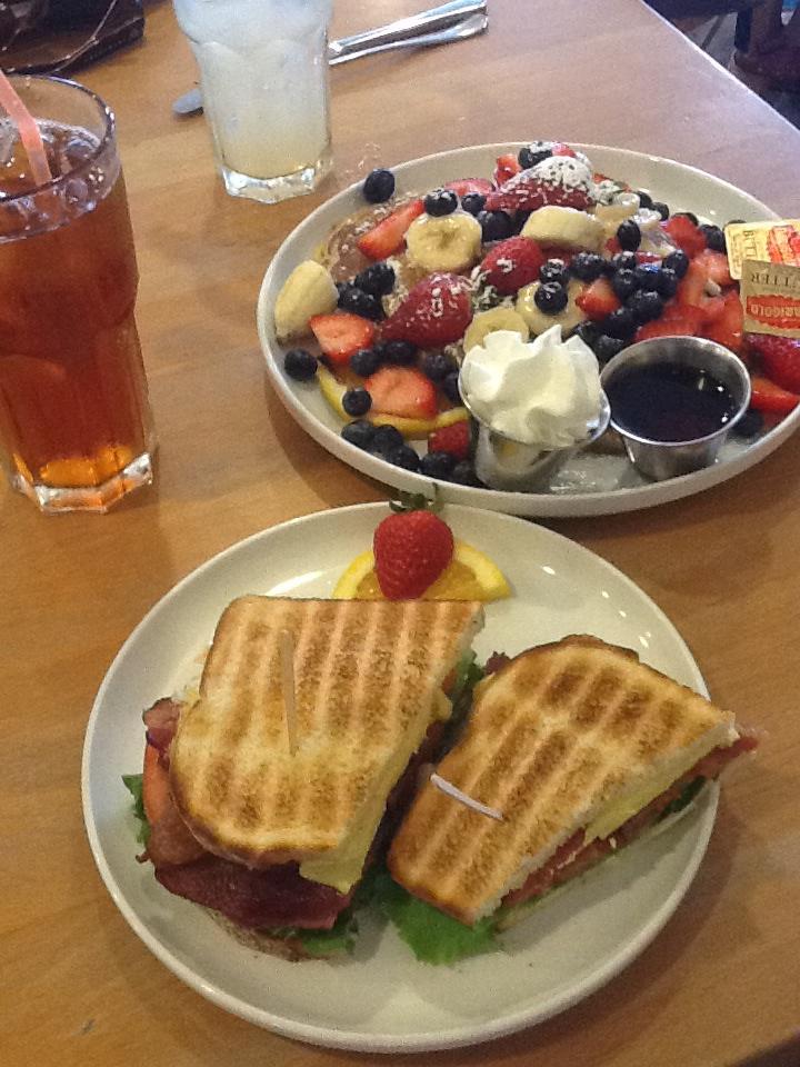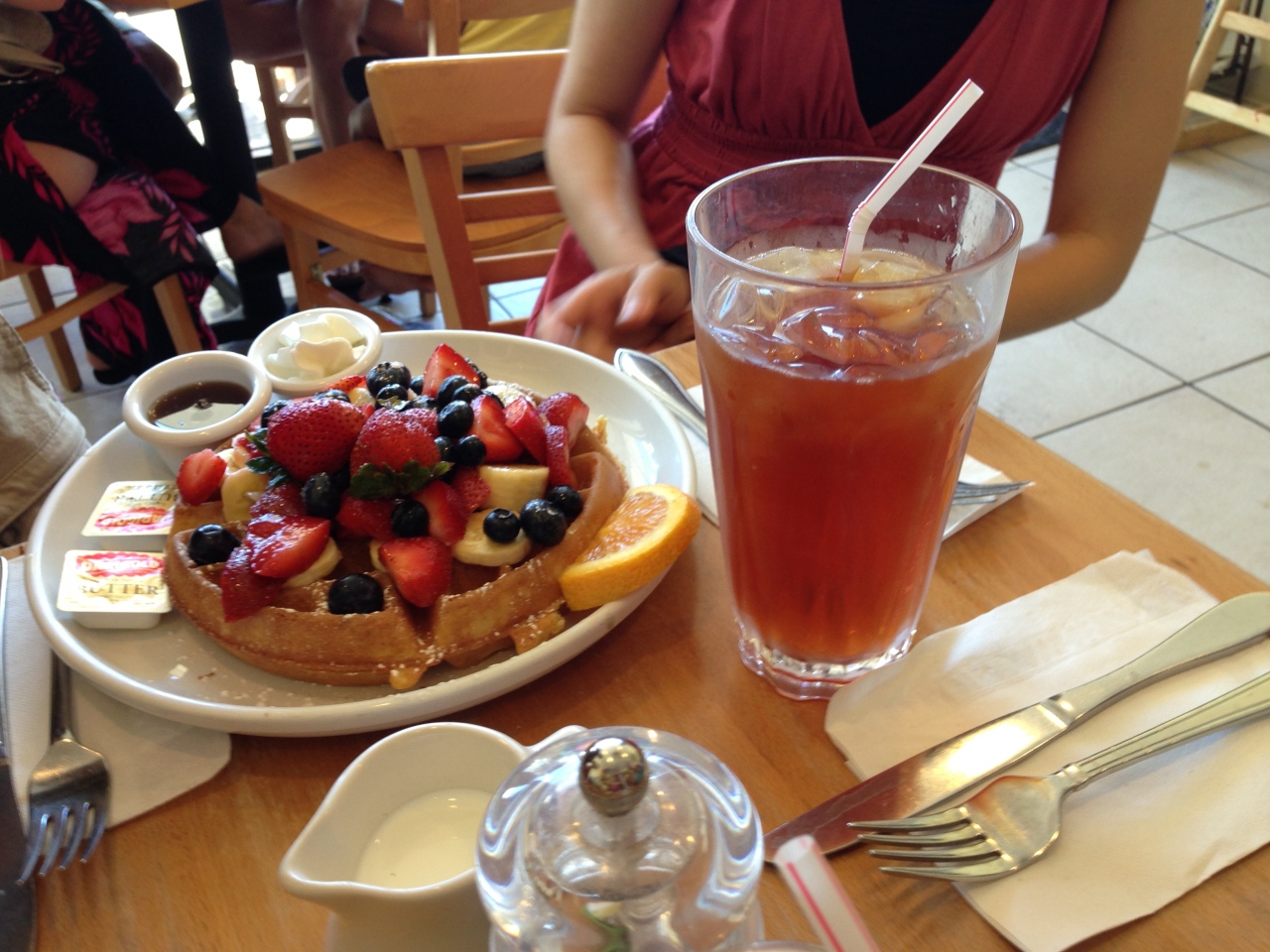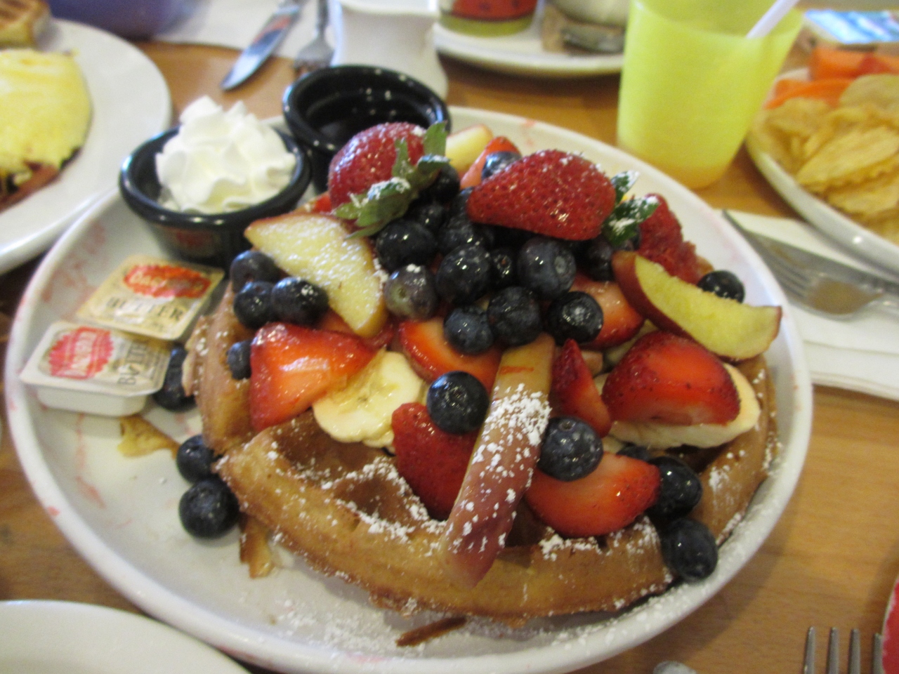 お昼時間になっていて、待つことなくすんなり奥のテーブルに通されました。パンケーキとフレンチトーストをそれぞれオールフルーツトッピングで注文し、私はパンケーキを食べました。フルーツの量があってお腹いっぱい。甘さはパンケーキのほうがあるけれどトーストのほうがボリュームがありました。その日初めての食事でしたが完食はちょっと無理でした。
