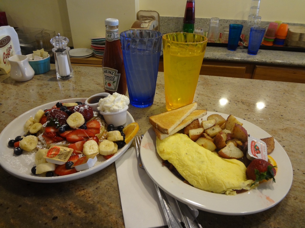 写真通りのキュートなフルーツてんこ盛りのパンケーキとスパイシー味のオムレツが登場しました。